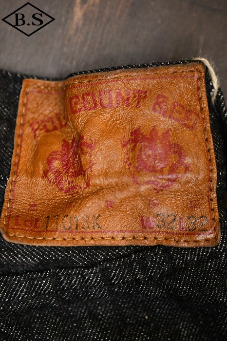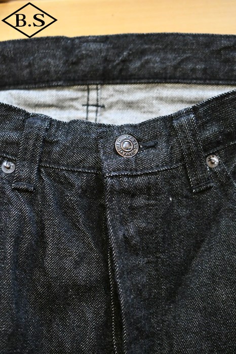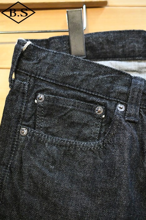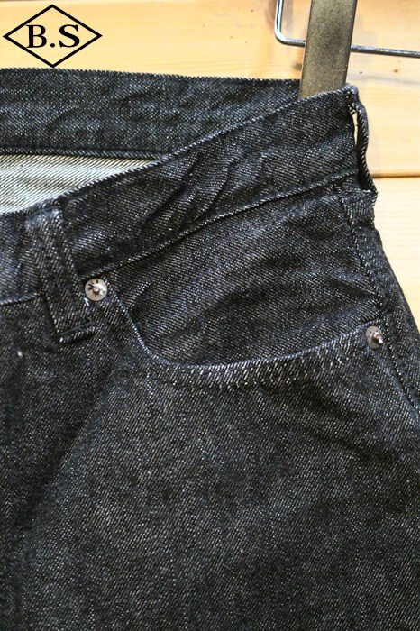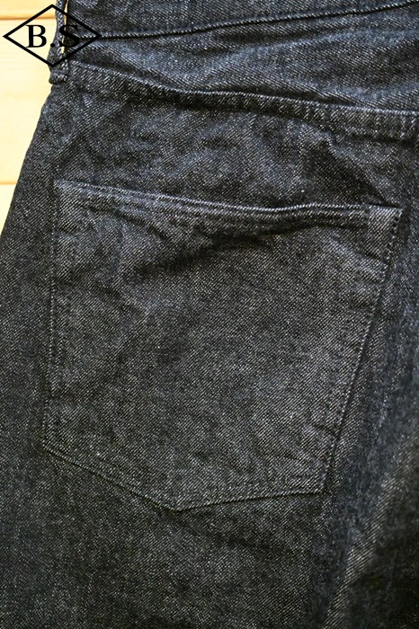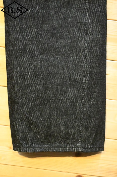インディゴ染めと比較してゆっくりとした経年変化ではありますが、ロープ染色されたブラックは徐々にタテ落ちも楽しんでいただくことが出来ます。ゆっくりと織り上げた13.7ozのセルビッチデニムは定番デニム同様力織機ならではの耐久性と穿き心地を体験していただけます。