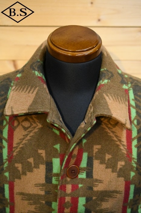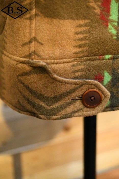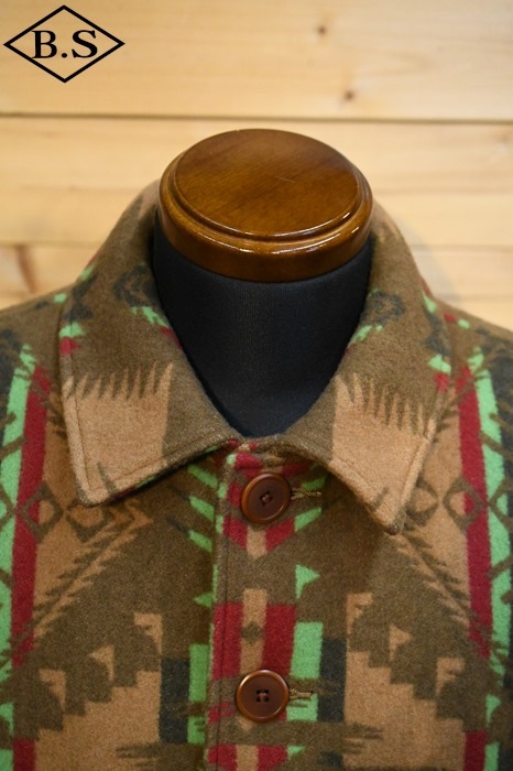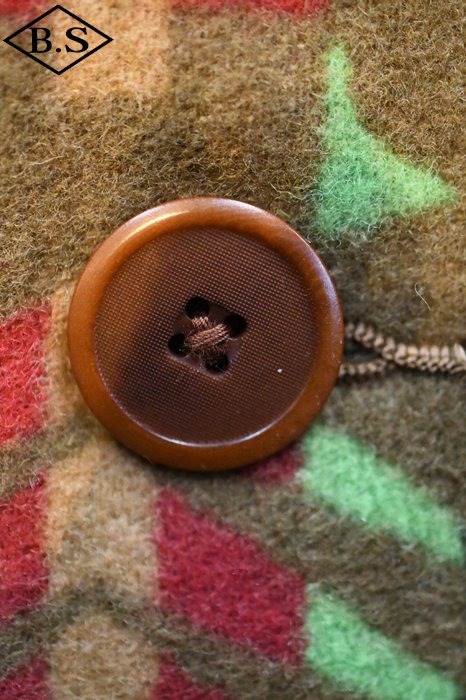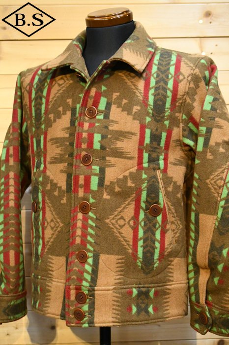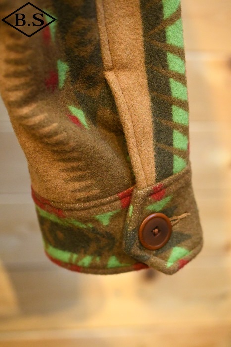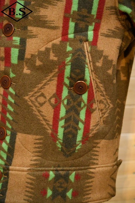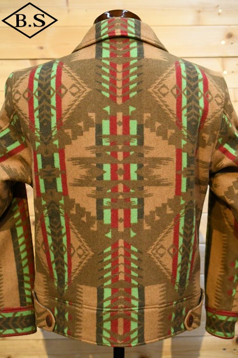 経糸にはあえて細い梳毛を打ち込むことで、緯糸の紡毛で打ち込んだ色糸が表に顔を出し、ネイティブブランケットの重厚な雰囲気を表現しております。何度も当時の柄の雰囲気に合うよう、糸色のビーカーの確認や配色のテストを重ね、2年がかりで柄を組み上げました。緯糸の柄・風合いを出す為、整理工場と打ち合わせをし、特別な軽いミルド(軽い起毛をかけたまま)で、再抑えしております。2色などの色数の少ないブランケットでは、タテヨコともに紡毛で織り上げより、分厚い表情もできますが、逆に色数が多く柄も複雑なものを表現した事で、大変な手間を要する生地となります。1930年代にあったA-1タイプのブルゾンをベースに、猫目のシェルボタンを贅沢に使い、ヴィンテージの様な雰囲気に盛り上げています。ヴィンテージでもこれが市場に出回ったら、とんでもない金額になってしまうであろうスーパーヴィンテージです。前回はパッチポケット仕様でしたが、よりヴィンテージにならってポケットの形状も変更しております。複雑な柄合わせや、丁寧で細かい縫製などにも拘った渾身の1着です。