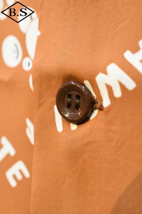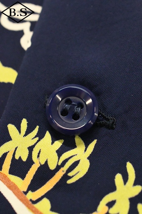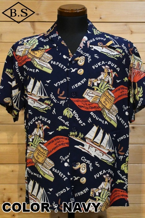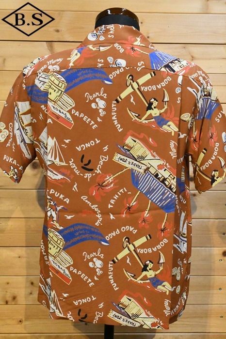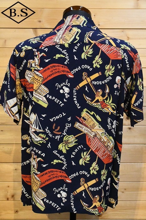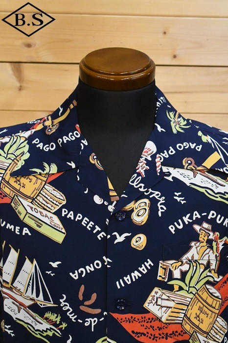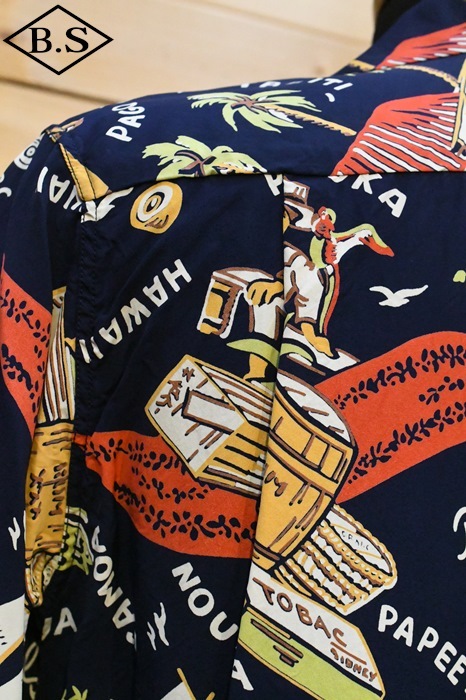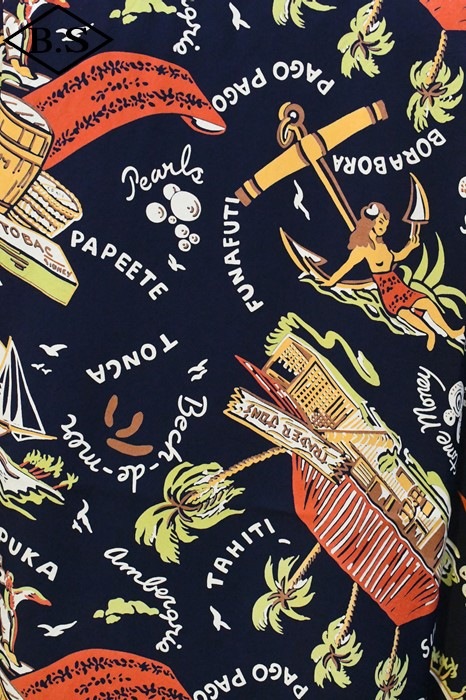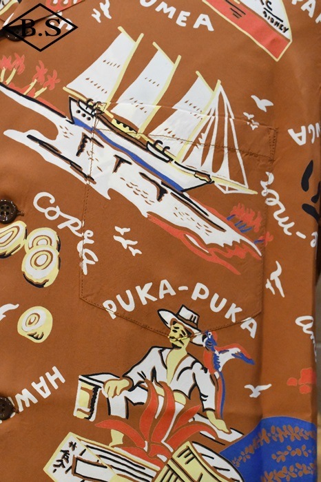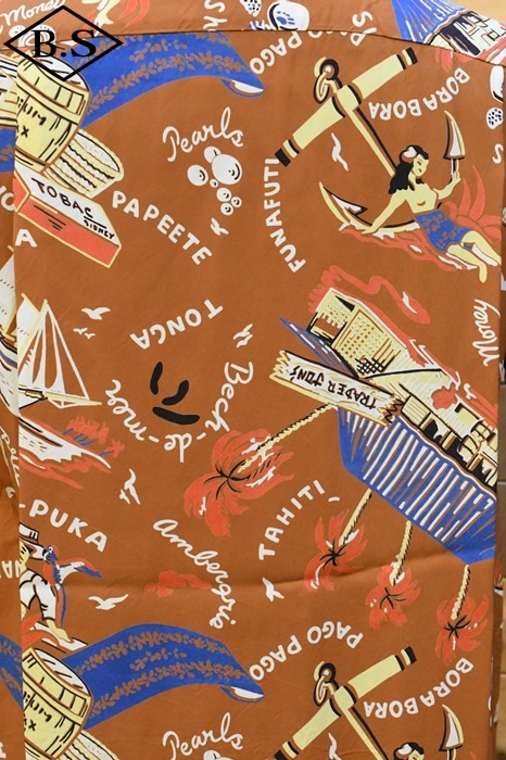 数あるヴィンテージ・アロハシャツの中でも非常に人気の「サウス・シー・トレーダー」。当時、テキスタイル・デザインの頂点に君臨していたデザイナー、ジョン・メイグスが手掛けた作品で、彼の憧れであったポール・ゴーギャンが活躍したタヒチをはじめ南太平洋の島々を題材にしており、特別な思い入れがあると語っていた。柄にメイグス本人が貿易商「トレーダー・ジョンズ」として描かれているところも彼らしいユーモアのセンスに溢れた一枚。