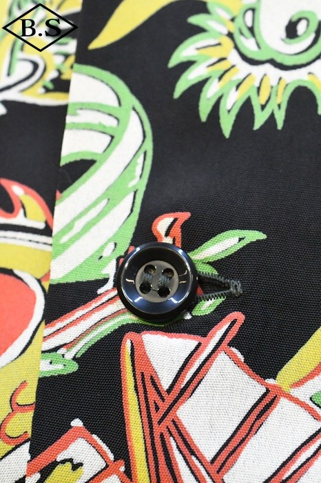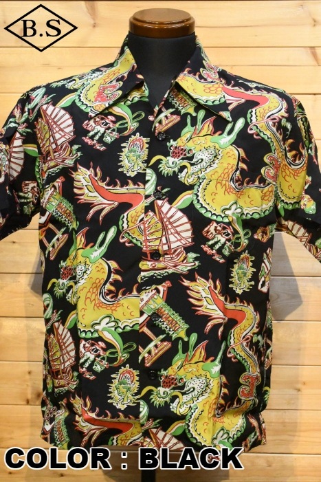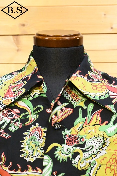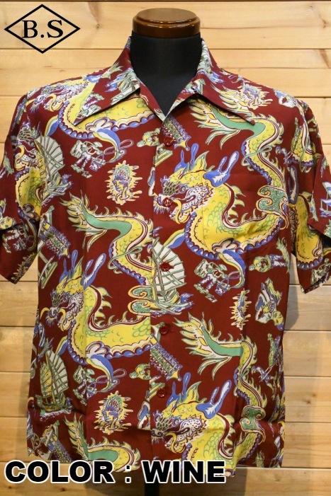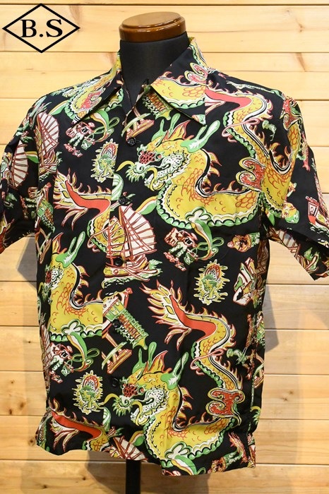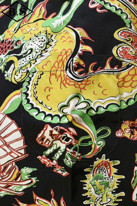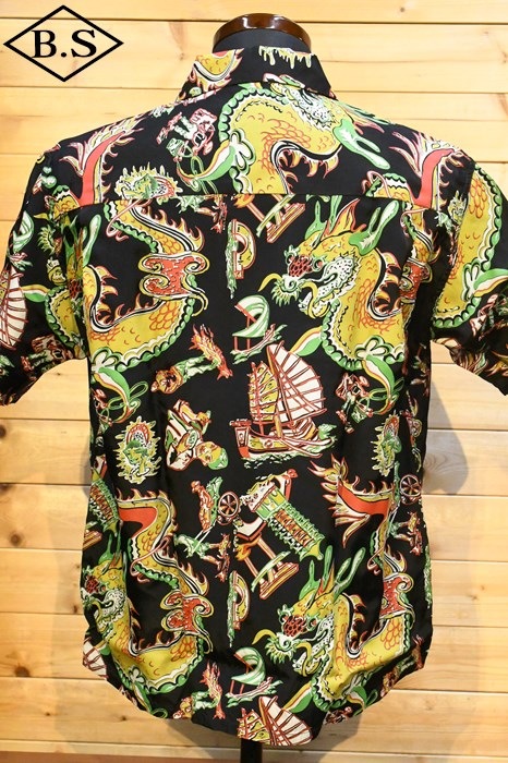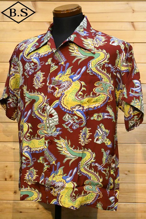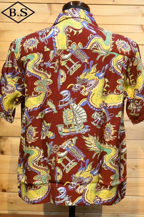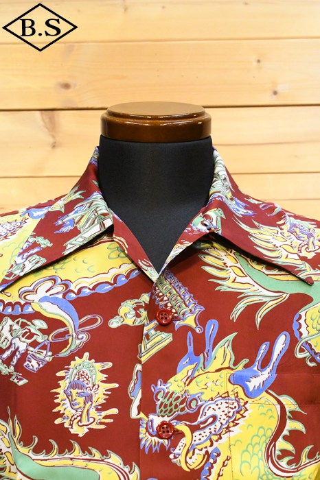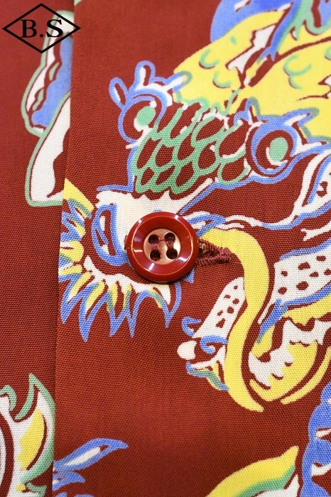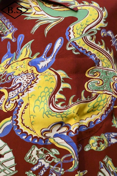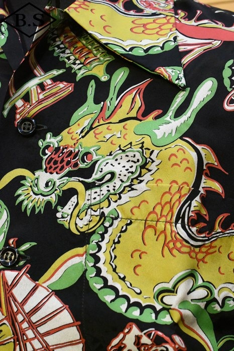 このデザインを手掛けたのは、シカゴの美術学校を卒業後にハワイ大学でも絵を学び、テキスタイルデザイナーとして活躍したムリエル・マーサー。ハワイのテキスタイルの世界では「レディ・ムリエル」と呼ばれ、人気のデザイナーであった。アメリカ本土のブランド、ハウオリ・カマアイナが製作し、抜染の効果が際立つ本作は、空を飛び回る龍をフィラメント・レーヨンの生地にダイナミックに描き、中国の寺院などもモチーフに加えられた非常に珍しいデザインとなっている。