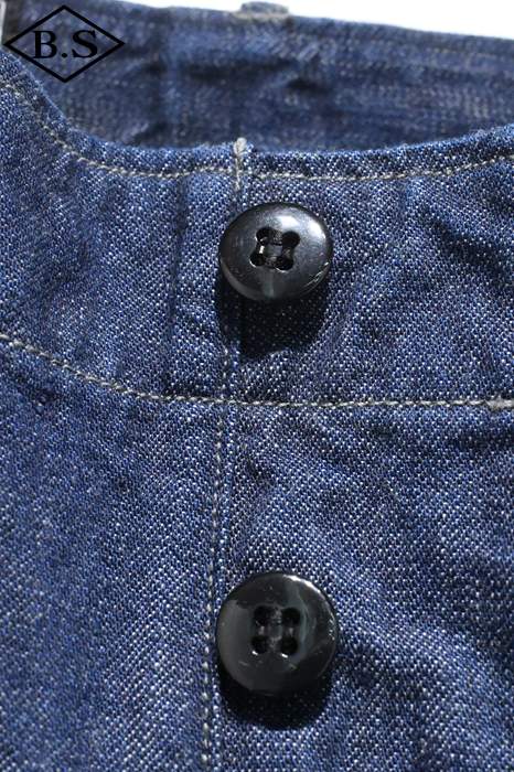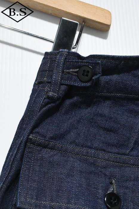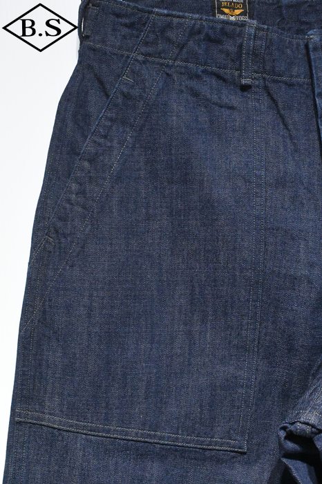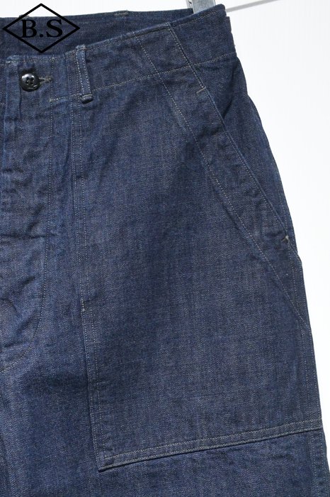 別名でファティーグ(雑役)パンツとも呼ばれ、戦地に赴く際だけでなく、内勤の作業中にも穿かれていたとされています。M-43パンツの後継として採用されたM-47パンツは、サイドに付く大きなカーゴポケットが廃止され、尿素ボタンが使用されました。このミリタリーパンツの雰囲気をそのままにライトオンスデニムで仕立てることにより、より使いやすいボトムスに昇華させました。青タグはランダムな縦落ちが楽しめるよう3種類の太さの糸を交互に織り込み独特の生地感を表現したデニムとなります。