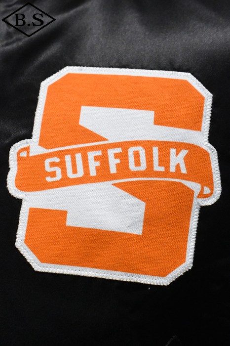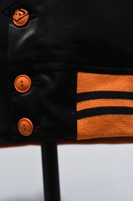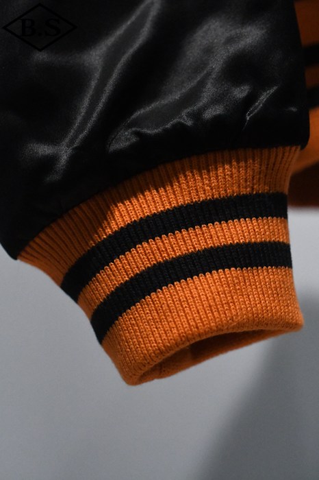 1930年代から1950年代にかけて製造されたChampion(R)(チャンピオン)の最初期のスポーツチーム向けウェアのうち、1940年代後期から販売されていた商品を復刻したサテンジャケットです。生地は1950年代のポリエステル生産開始以前に使われていたアセテート繊維100%のサテン生地を使用しています。裏地はポリエステルとレーヨンで作られたフラノ生地で、身頃部分は表側の起毛面、袖部分は裏面を使用していた当時の仕様で復刻しています。フロントのボタンの形状や「流れハトメ」という仕様のボタンホールも踏襲。左胸のアートワークも当時のものの復刻で、天竺生地に染み込みプリントしたモチーフを刺繍機でかがり付けています。