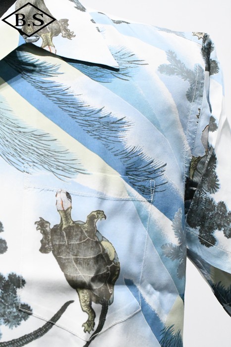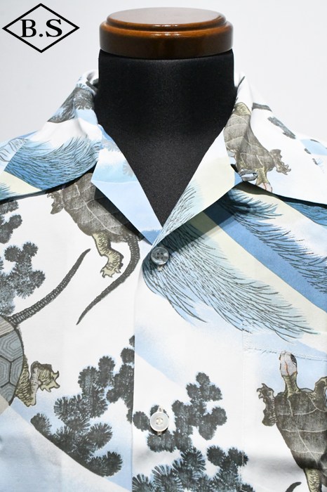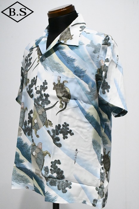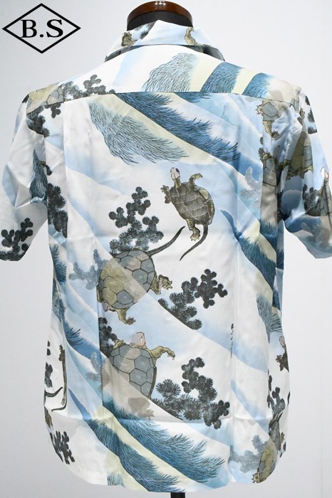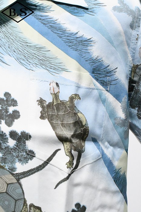 吉祥を題材とした北斎の花鳥画シリーズ。この「亀」以外に「桜花に鷹」「鯉の滝登り」「雪松に鶴」「牧馬」などがある。本作では画面を斜めに横切る青色のぼかしで揺蕩う水の流れを表現し、水中を漂う3 匹の亀を上から覗き込むような構図で描写。甲羅に藻がついた一番下の「蓑亀(みのがめ)」は長寿の象徴で、親亀とともに子亀、孫亀も描かれており、子孫繁栄を表現している。またこの花鳥画シリーズは長大判と呼ばれる縦長の判型で、吉祥の掛軸の代わりとして制作された。実物を見ると、北斎は水面の青い部分に藍顔料を用いている。それに倣い、このシャツも藍顔料を使って捺染しているのが特徴。また当時、亀の頭の部分には銀が使われていたが、シャツ用としては適さないため実物の色合いに近い銀色の顔料を使用している。