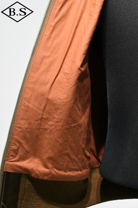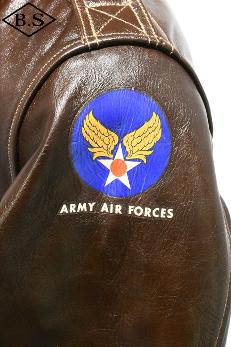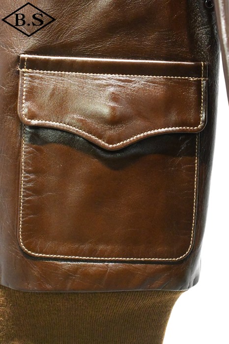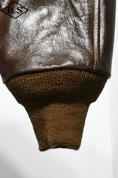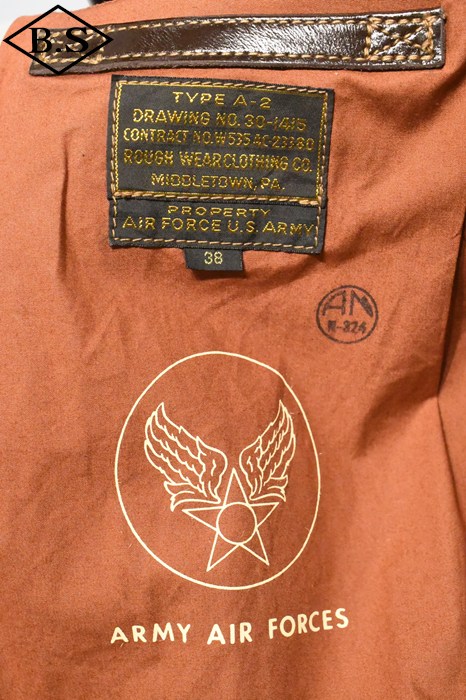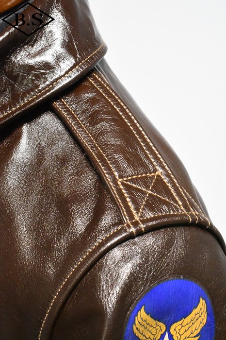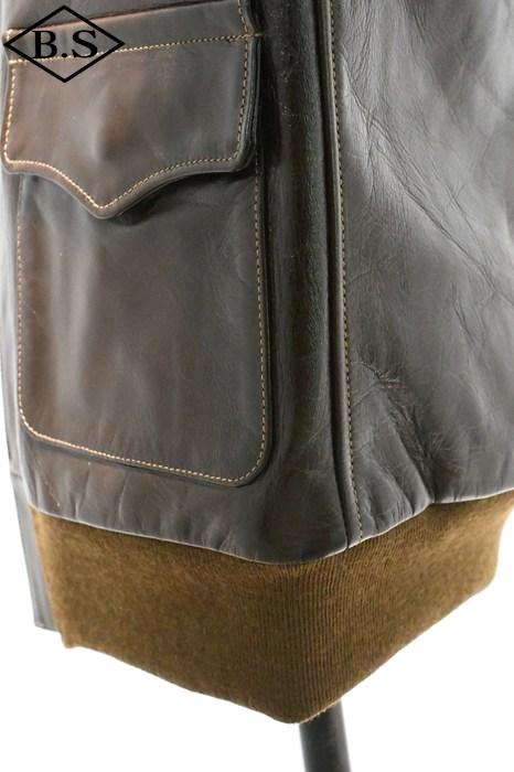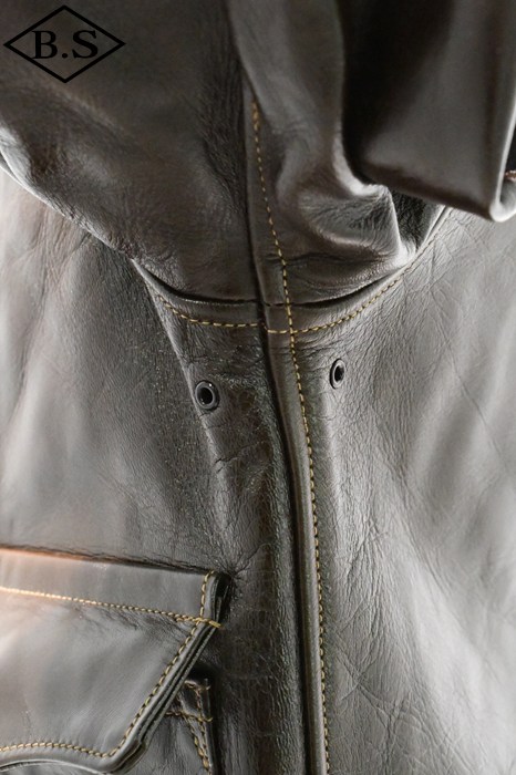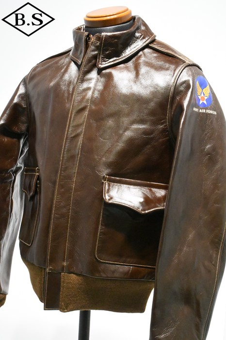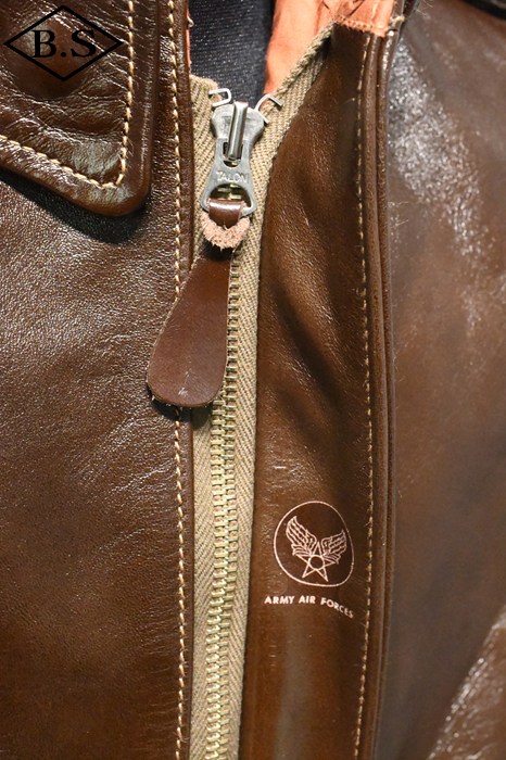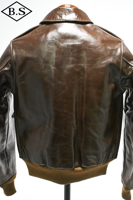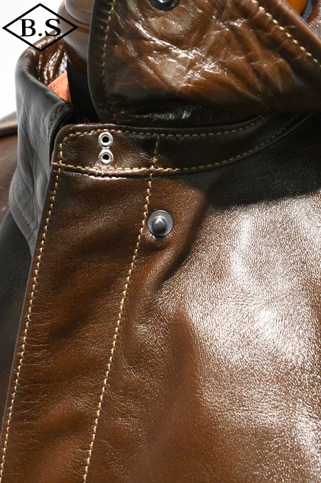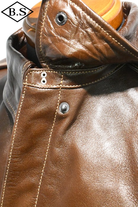 A-2のコントラクターでも生産性のある工場背景を持っていたラフウェア社。計5回の納入を果たした同社のこのモデルは1942年契約の4番目にあたる。米陸軍航空隊は1942年の途中から“プロパティー・エアフォース”の表記を義務付けしたため、2枚のラベルを重ねて縫い付ける、所謂2段ラベルが特徴となっている。また、台襟の付いた大型の襟などラフウェア社らしい迫力のあるフォルムを持っている。このジャケットに使用している革は、イタリア産の原皮を樹皮から抽出したタンニン槽に漬け置きし、濃度を変えながらゆっくりと時間を懸けて鞣されている。丹念に鞣された後、職人の手によってシールブラウンのアニリン染料が擦り込まれている。多少の色むらがあるのは手作業ならではの証であり、革の愛好家からも好まれる仕上げである。アニリン染料で仕上げた革は、ラッカー仕上げと比較すると色に透明感があるため、使用感や経年変化で革自体に表情が出やすいのが特徴。渋液と染み込んだ染料が革の奥底に宿るこのジャケットは着用毎に表情が磨かれる。