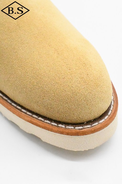このレザーはレザーの起毛面を薄くスライスしてつくる多くのスエードレザーと違い、レザーの繊維密度が最も高い部位である銀面(レザー表面)を内側に使い起毛面を外側に使う、つまりレザーを裏返して使うラフアウトレザーであり、元々アウトドア用の靴に多く用いられるものでした。履き込んでいくと汚れなども深い味わいとなる、経年変化が楽しめるレザーです。