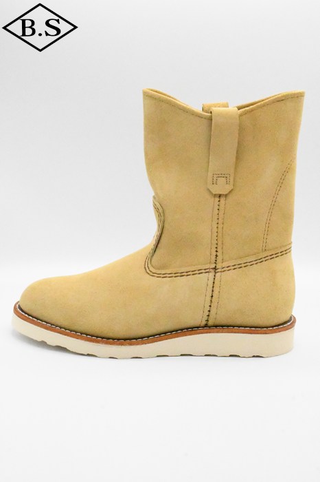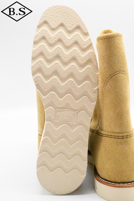 #8168は、この#866をベースにした日本企画商品として1996年に誕生しました。当時、赤茶色のオロラセット・ポーテージ#8866、厚い塗膜を持つブラック・クローム#8169と並んでレッドウィングの三大レザーであったベージュ色のラフアウトレザー、ホーソーン・アビレーンを使ったモデルとして発売されました。