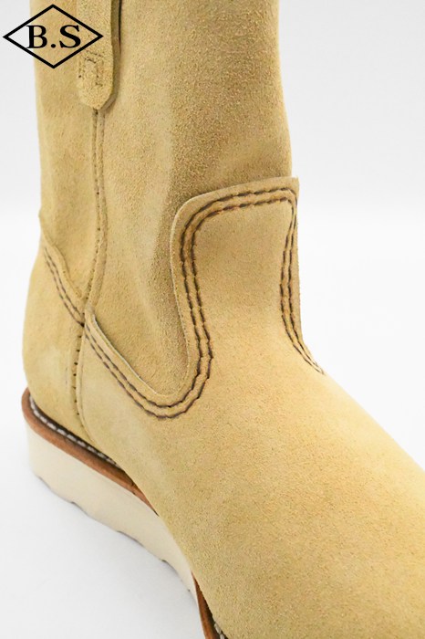 ペコスブーツはレッドウィング社の開発した、ウエスタンブーツタイプのワークブーツです。元々スペインの乗馬靴に由来するウエスタンブーツは、左右両側に縫い目のあるサイドシームの筒を持つプルオンブーツで、その多くはつま先がやや尖った形をして高めのヒールがついています。これは乗馬の際に鐙(あぶみ)にスムーズに足を入れて踏ん張るのに適していたからです。