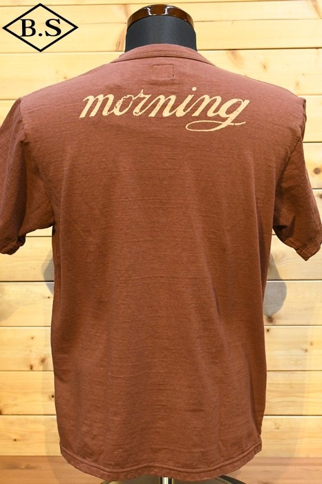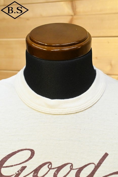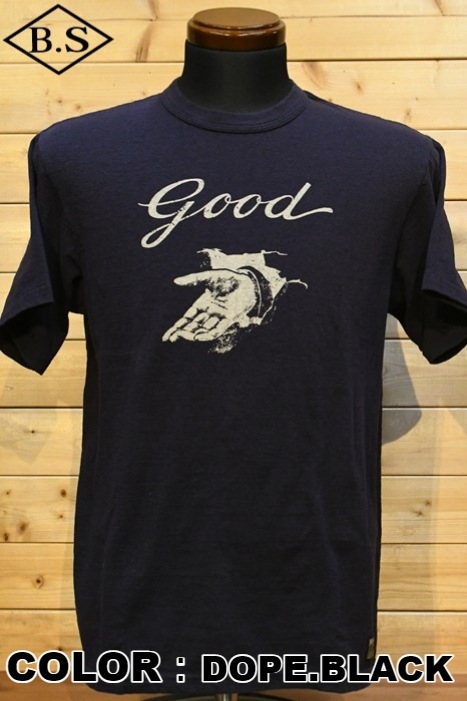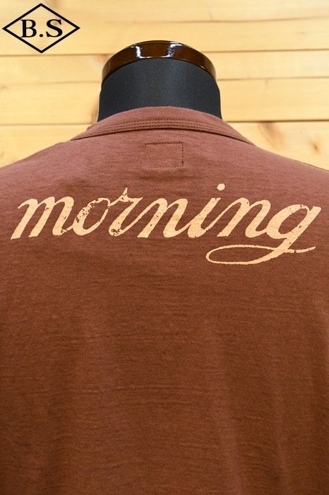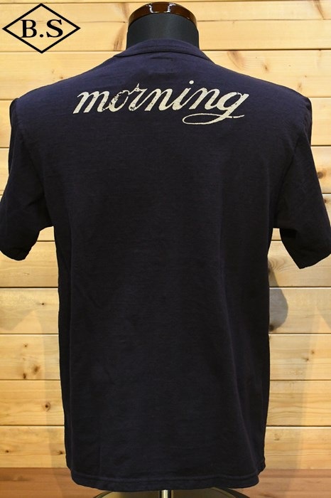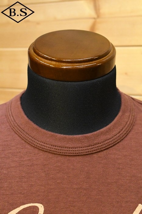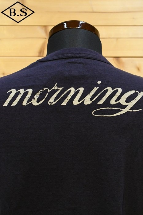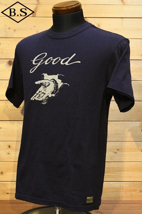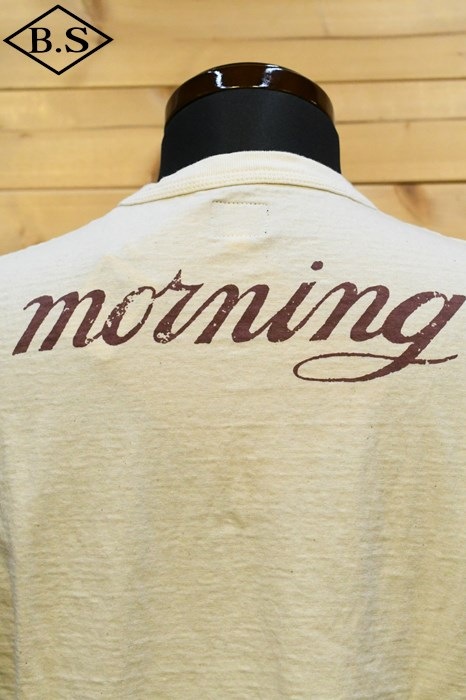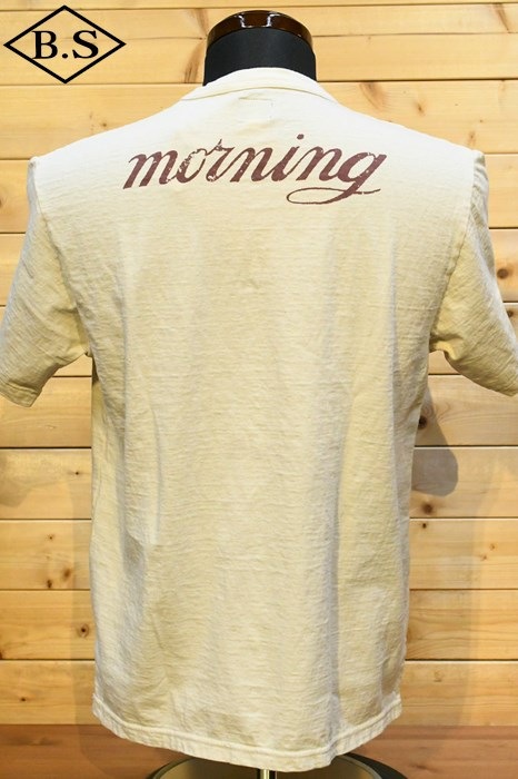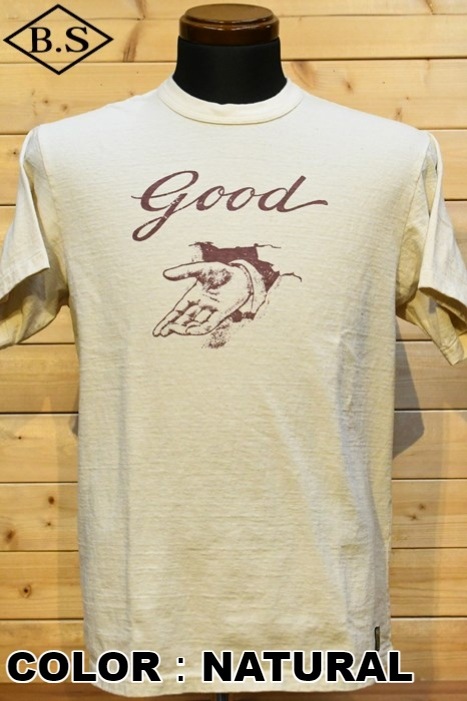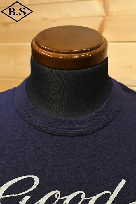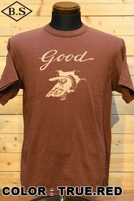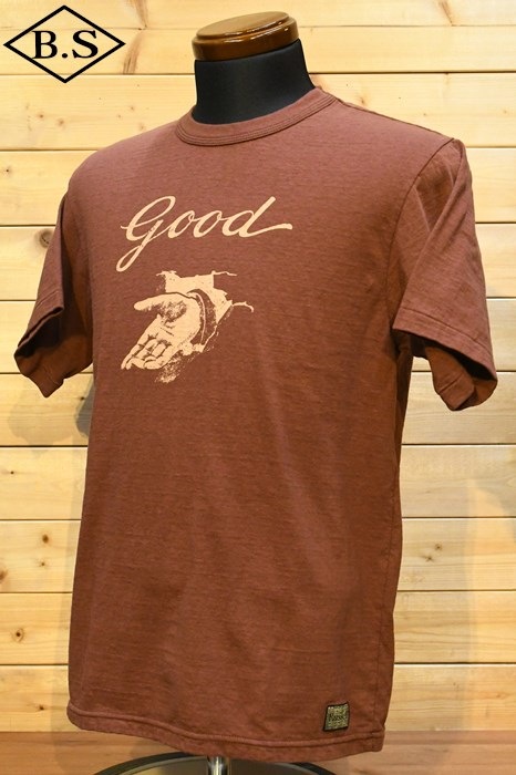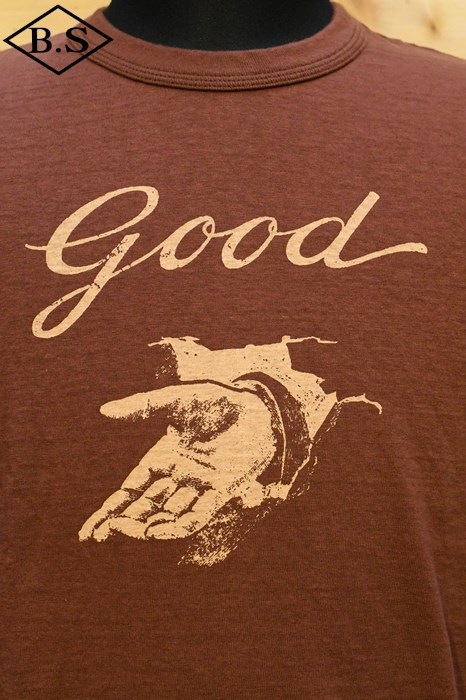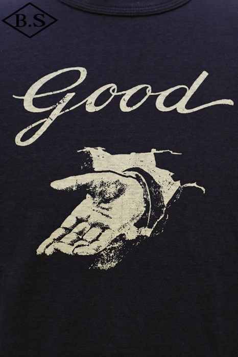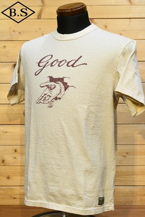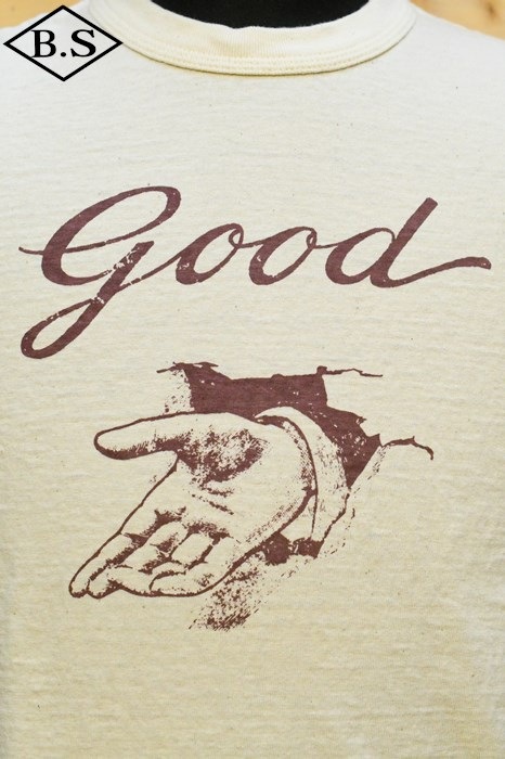 和歌山の旧式吊編機により、ゆっくり空気を含みながら編み上げたオリジナルの丸胴生地。凸凹のムラ糸表面をガスバーナーで焼き、毛羽を焼却したガス焼きスラブ糸から編み上げた天竺素材は、至高の着心地とサラリとした手触りそして横に走る凹凸感が雰囲気抜群のTシャツです。デザインは、狂騒の1920年代実在のハンドシェイク柄。