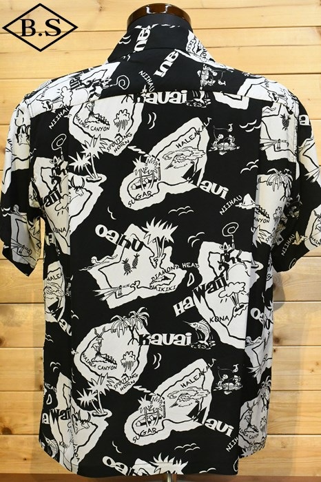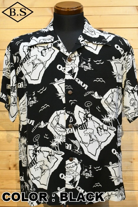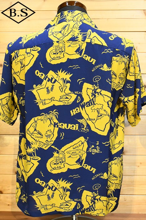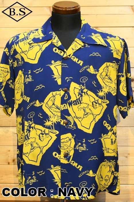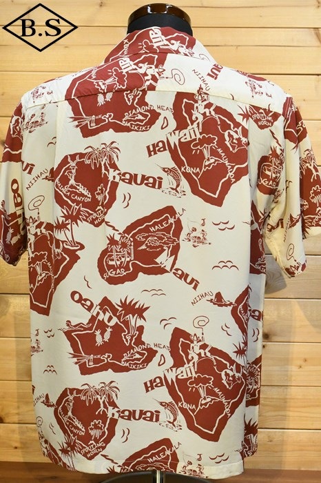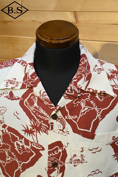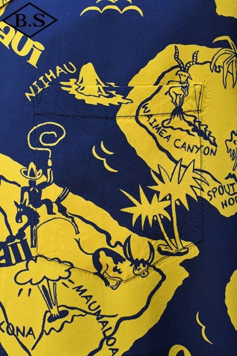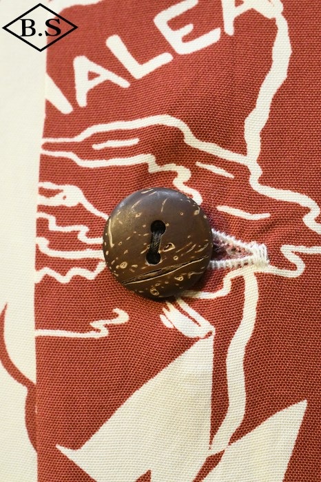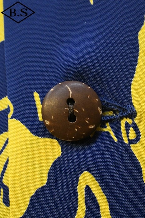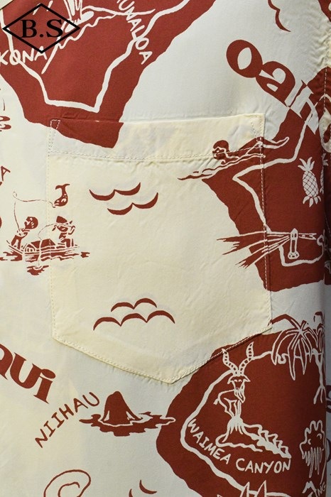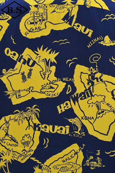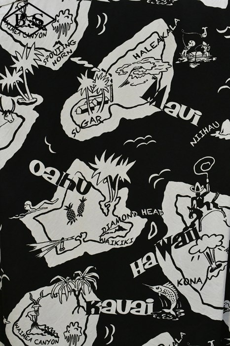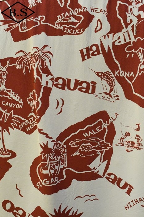現地ハワイの日系人だけでなく、アメリカ本土の観光客からの支持も得ていたオリエンタル・デザイン(和柄)。なかでも鷲・虎・龍に加え、鯉や兜などの縁起が良いとされる柄が好まれた。それらの柄は、もともと男児が節句に着る和装用の柄をベースとしている。本作は、二匹の虎と岩の合間を縫って流れる清流を中心として描かれた、虎柄の中でも比較的多く見られる構図。威嚇し合う虎と流れる水の躍動感を多色のオーバープリントで繊細に表現した一枚。同じデザインでフジエット素材のものも確認されており、当時も人気であったことがわかる。