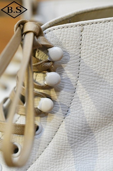 黒と白の、いわゆるコンビの靴は、1860年代のイギリスでクリケットシューズとしてつくられたのがその始まりと言われています。短靴においては、1920~30年代に伊達男が好むスタイルとして広く用いられ、時代を象徴する靴のスタイルともなりました。ブーツではあまり見られない、しかしモカシンタイプのつま先にはよく映える、ブラックとホワイトのツートーンを採用したSportif 2 “Chamonix”。ブラックのレザーにはアノネイ社のカーフ、ホワイトの型押しレザーは国産のステアハイドです。