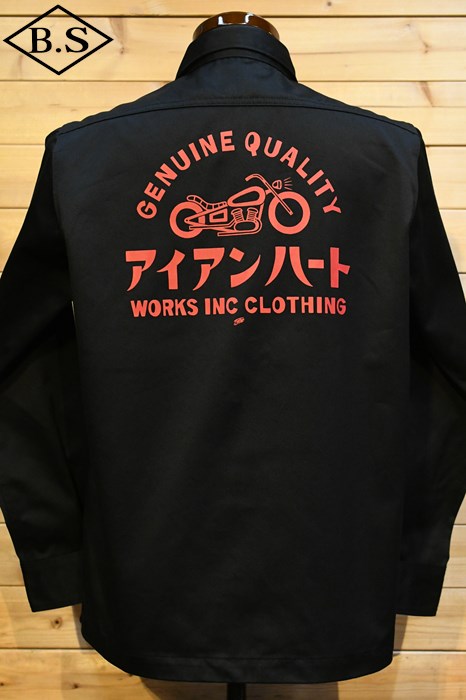 バックにはホッピングシャワーのテツ氏によるカタカナのアイアンハートとバイク柄のプリント入り。
