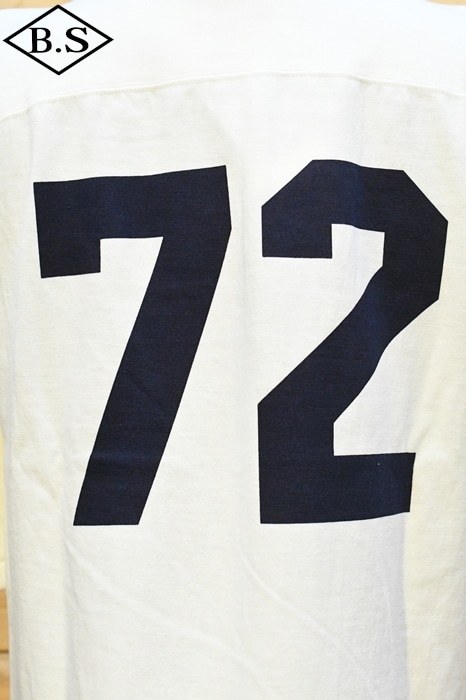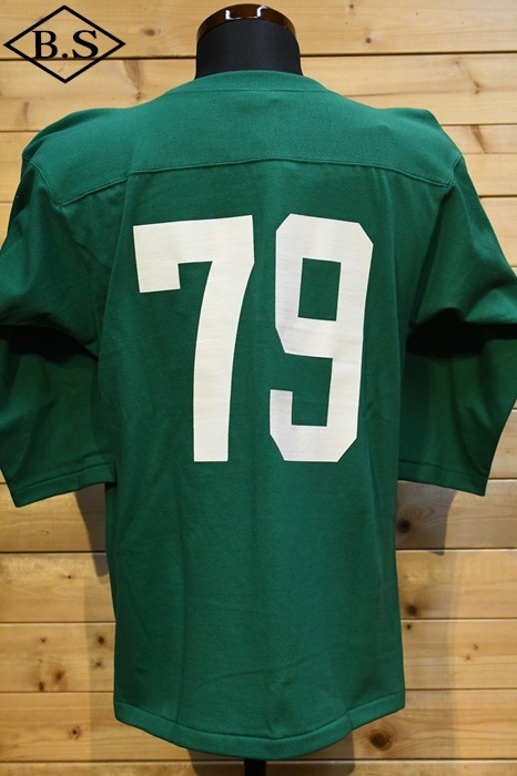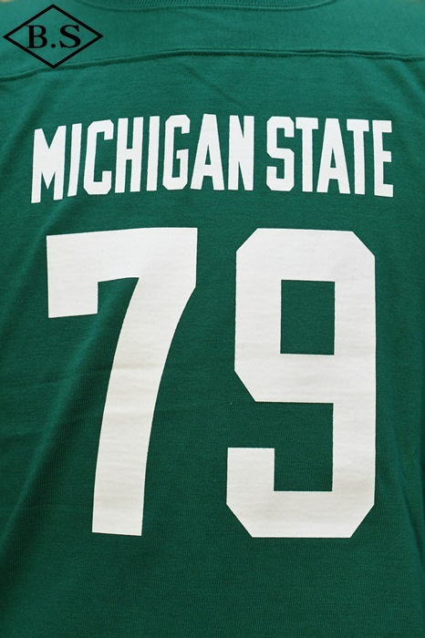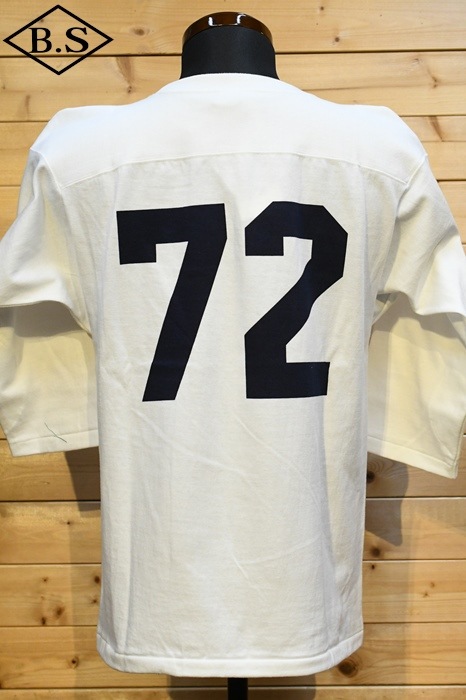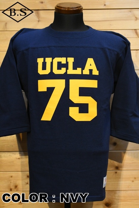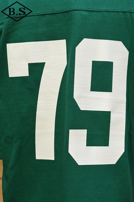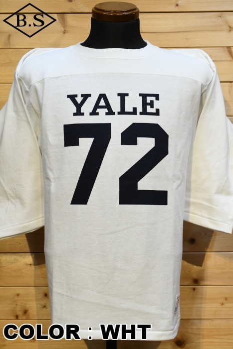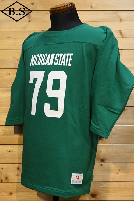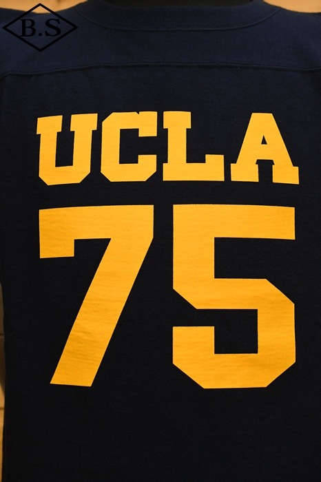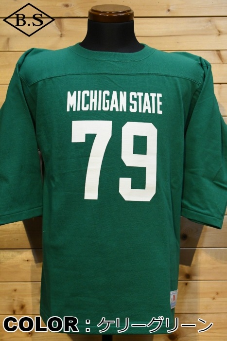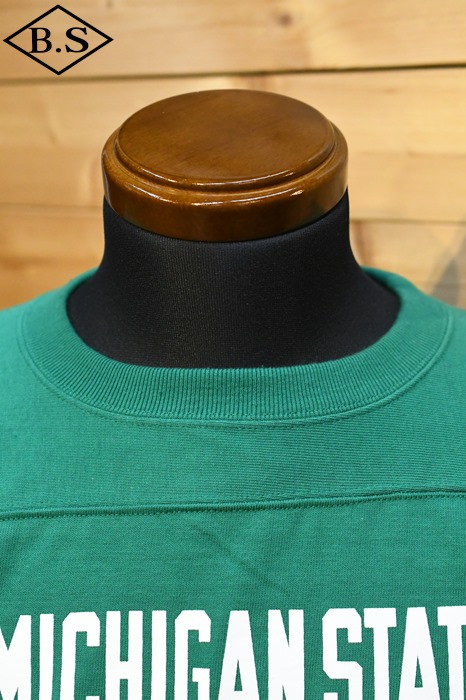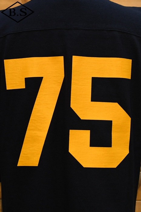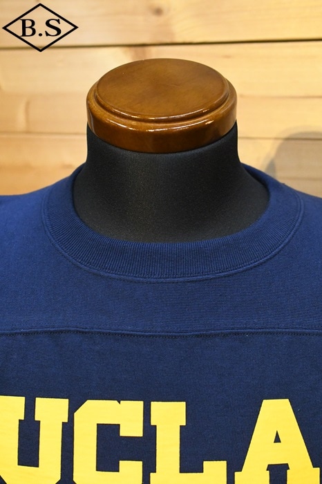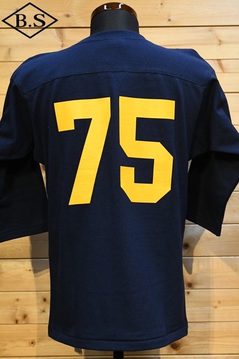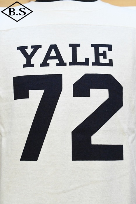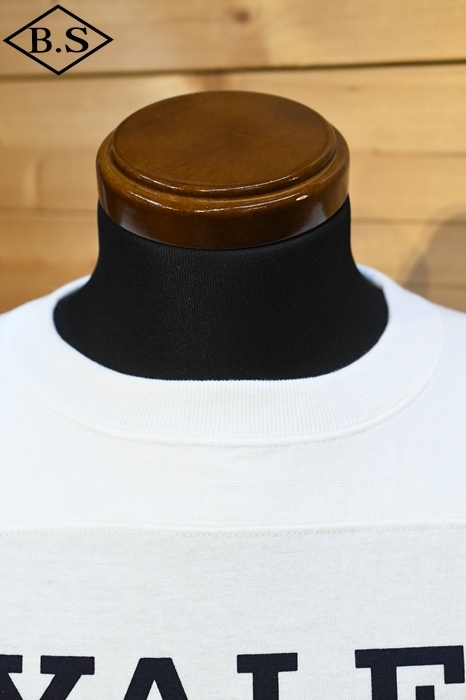 1960年代にキャンパスウェアとして開発したフットボールTシャツを復刻した、3/4スリーブフットボールTシャツです。当時のフットボールTシャツは、練習着として開発したものに比べて薄い生地ながら、強度を高めるため肩の生地を二重にした造りで、初期モデルにはエルボーパッチも付いていました。この商品はそのエルボーパッチをはじめ、肩のヨーク部分の2本針ステッチ補強など初期モデルの特色を復刻したものです。グラフィックは、大学のブックストアで販売されていた当時の、大学名と卒業年のナンバーを入れたデザインを踏襲。オフィシャルライセンスによる「YALE(イェール大学)」、「UCLA(ユーシーエルエー/カリフォルニア大学ロサンゼルス校)」のプリント入りで、左袖にCロゴワッペンが付いていない点も当時の仕様そのままです。2024SSシーズンは新色として、「Michigan State University(ミシガンステイトユニバーシティー/ミシガン州立大学)」のプリントを追加しました。