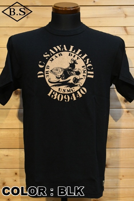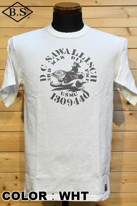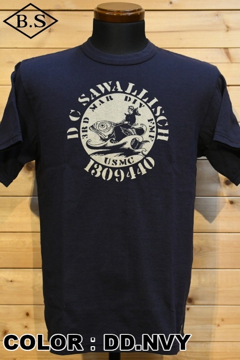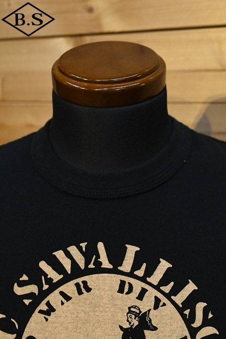 和歌山の旧式吊編機により、ゆっくり空気を含みながら編み上げたオリジナルの丸胴生地を使用したTシャツ。空気紡績糸によるドライな質感と絶妙な厚さが1940年代を彷彿しながら、サラッとした着心地がクセになります。デザインは、変動と鼓動の1940年代のU.S MARINE柄。