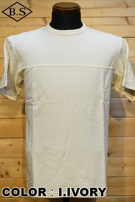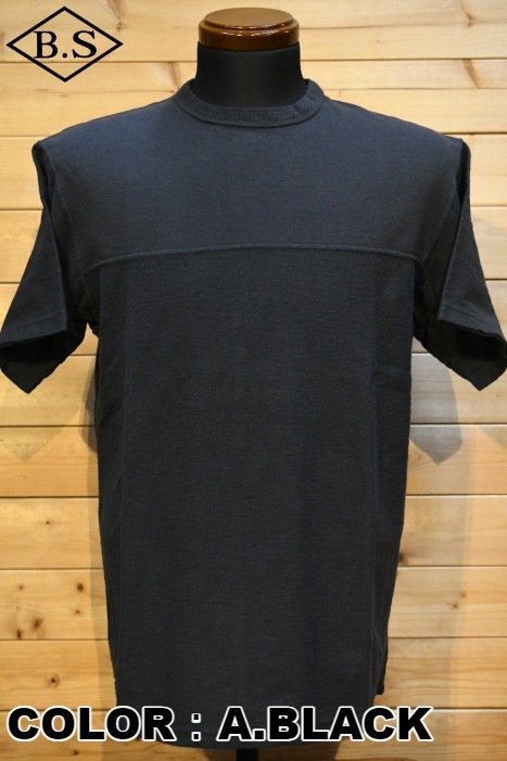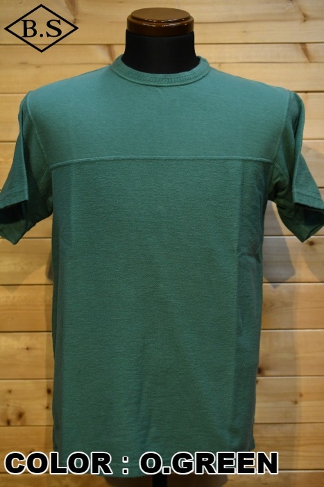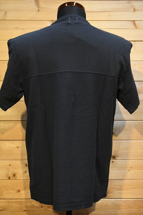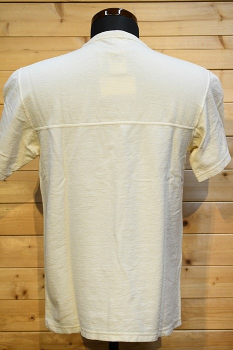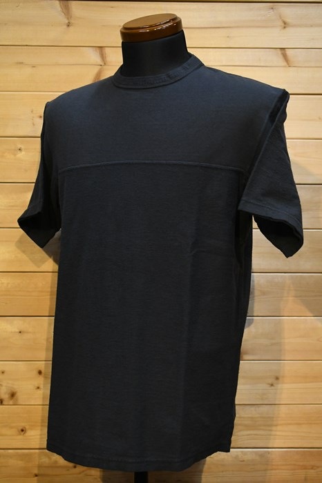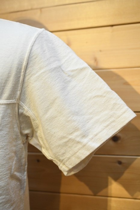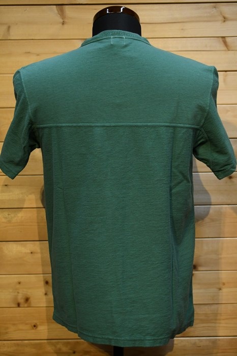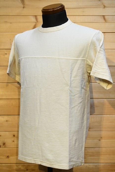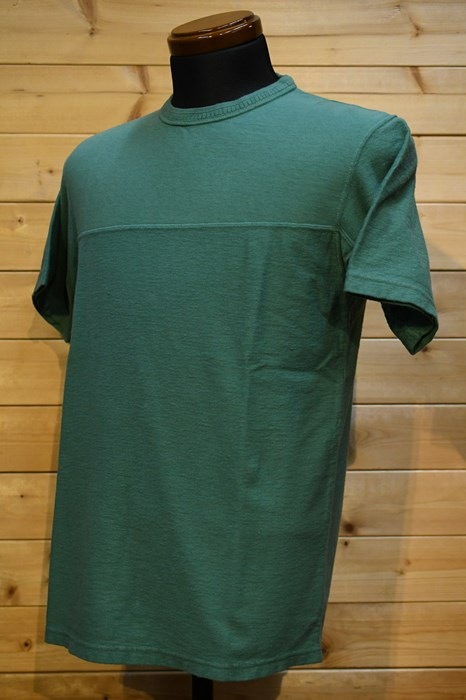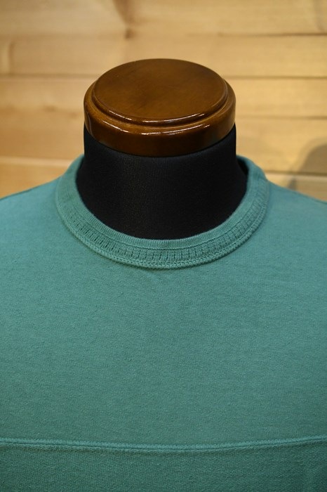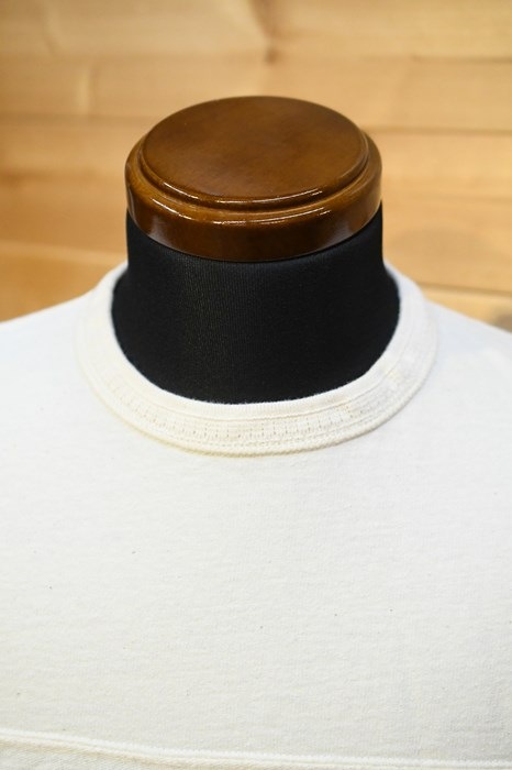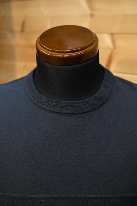 風合い、着心地に優れるリサイクルコットンショートパイルを用いた切り替えショートスリーブネック。
