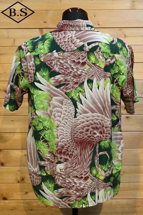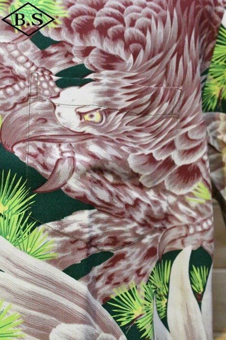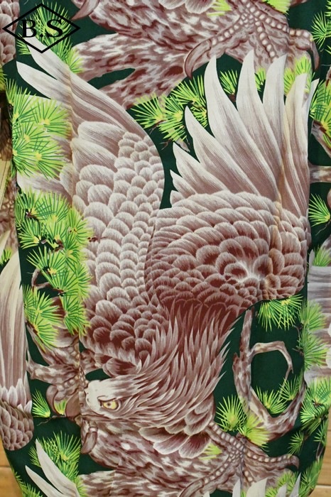 今にも獲物に飛びかかろうとしている、羽を広げた鷹の姿を描いた大作。メイン・モチーフの鷹とグラウンドに描かれた松の枝と葉で構成されたシンプルな作品であるが、そこから伝わる躍動感と迫力は他の鷹や鷲を題材にした柄の中でも一際目立つ存在。力を込めて枝を掴む爪と獲物を捕らえた鋭い眼光など、屈強な鷹の迫力が伝わり、このデザインを手掛けた当時の職人たちの高いレベルがわかる一枚。