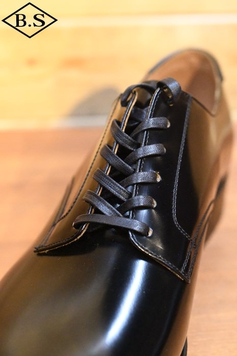 開発のベースとしたのは、JELADO 後藤が所有するおそらく1940年代のサービスシューズです。後年のものよりわずかに尖ったつま先、6対の隠しハトメ、カカトに付くT字型の市革など、初期型のアッパーデザインを持ったものです。これを、滑らかで美しい艶を持つ茶芯のキップガラスレザーで再現しました。
