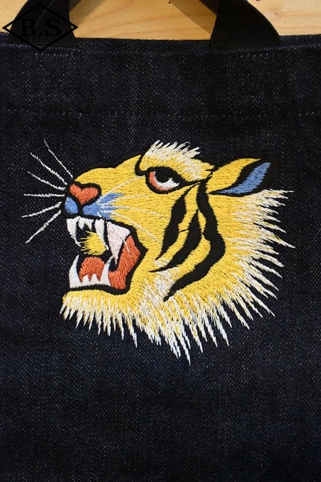 素材はラストリゾートデニムを使用し、弊社のスカジャンに使ったフロントの虎の刺繍を入れることによりアクセントを利かせました。