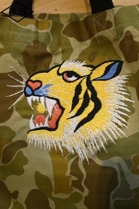 毎シーズン即完売の人気アイテムである「YOIYOI BAG」をボディを変えて製作しました。IN FIELDER DESIGN(インフィールダーデザイン)さんとのコラボレーションをして、シンプルで画期的な「YYB(酔い酔いバッグ)」をリリースしました。バックサテンにハンターカモプリントを施した素材を使い、弊社のスカジャンに使ったフロントの虎の刺繍を入れた個性的なBAGを製作しました。刺繍糸はレーヨン糸を使用しているため、使い込むたび褪色し経年変化が楽しめます。ハンドルをゴムにすることで手に通すだけで、密着し中の物を落とすことのない「Y(酔っぱらっても)Y(良い)B(バッグ)」を作りました。手首にはめることにより両手も使えますし、置き忘れのトラブルもない実用に向いたグッズとなります。