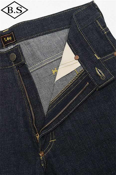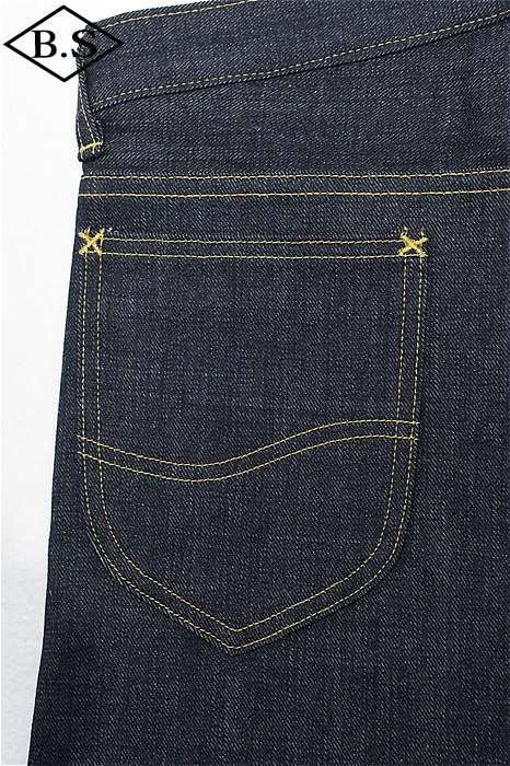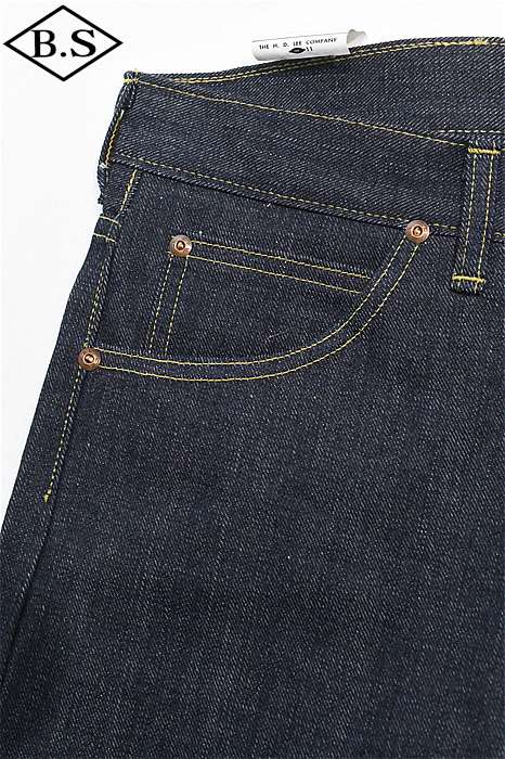 OGIVE POCKETにはLeeのロゴを配したHPL(ヒップ・ポケット・レーベル)がアイコンとして輝き、のちに、トゥウィッチ・ラベルと呼ばれる防縮処理が施されていないレザー・レーベル、ウエストベルトのセンターには赤タグ、そして縫製強度の不安から小股部分に残る補強リベットに進化の過程を垣間見ることが出来る。
