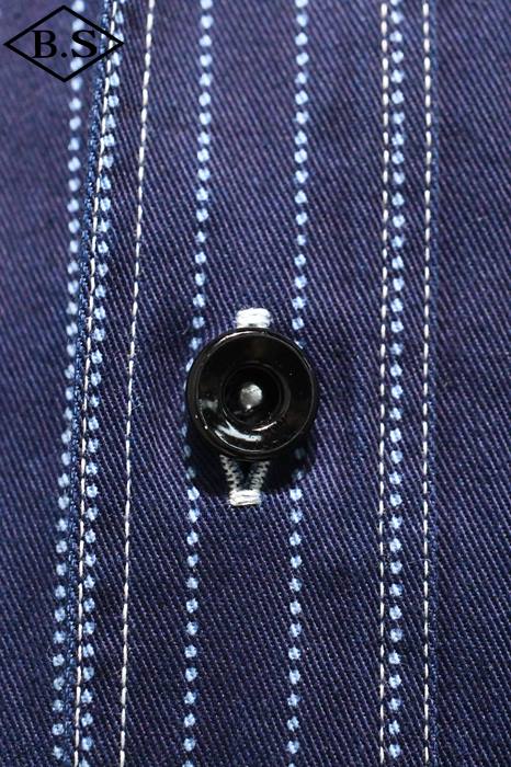 巻き縫いの終わり部分は空環始末。 フロントのボタンはキッズオーバーオールなどに使用されていたドーナッツ型打ち込みタイプのメタルボタン。