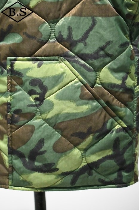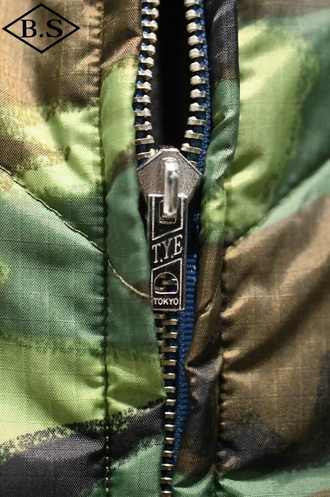 瓢箪型のキルティングステッチが入ったミリタリー由来のカモフラージュ柄ナイロン製リップストップ生地は、