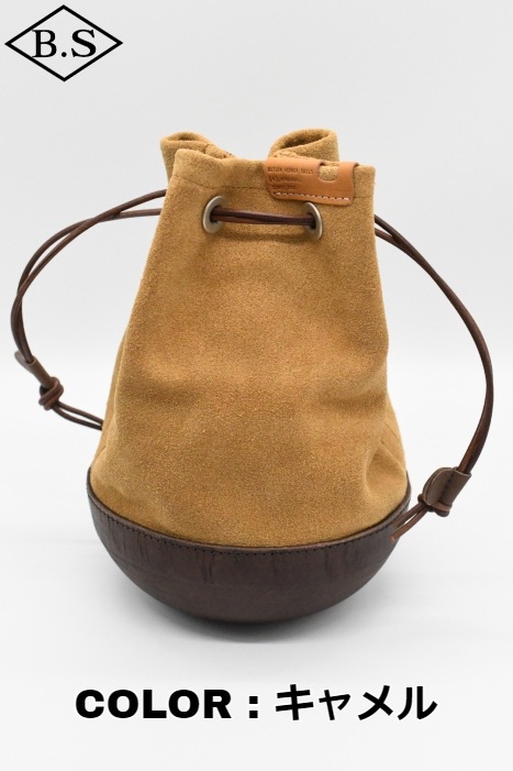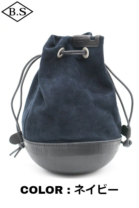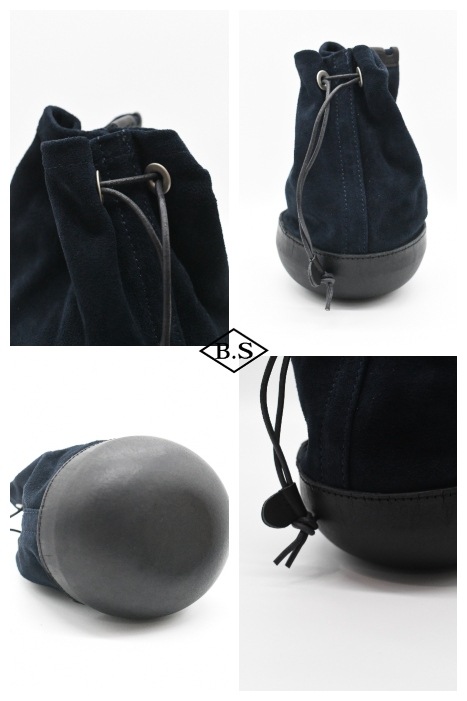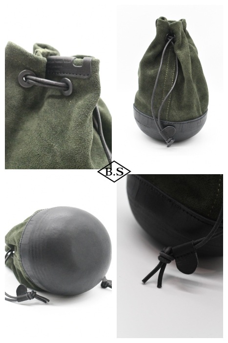 長年、企画し続けた規格の商品です。 業種の異なる職人さんにお願いすることでやっと出来あがりました。 底の部分が、本革で、硬いボール状に成型されています。 その下部分を上部とつなぎ合わせる事で完成します。 大量生産ができない代わりに、付加価値が高く、お客様においても 興味が湧く商品に仕上がっています。 長財布が縦に入る高さです。使い込むことで下部の革が少し柔らかくなる事があるかもしれません。 紐部分は牛革の丸紐を使いました。