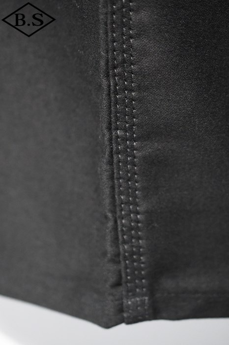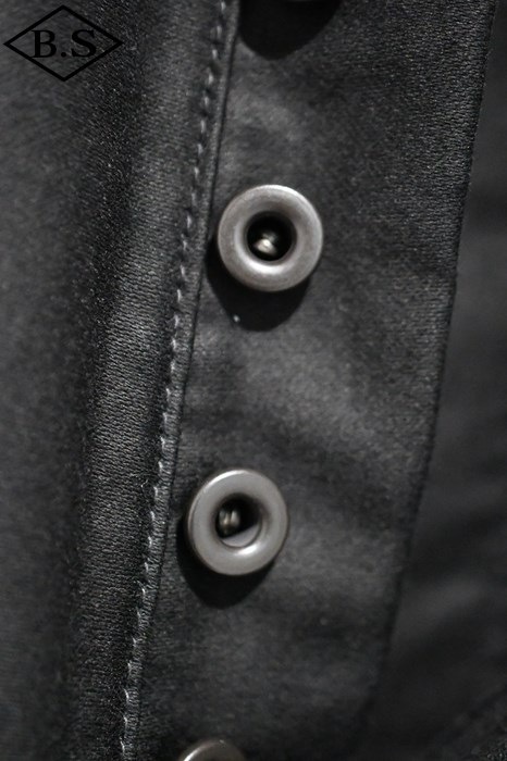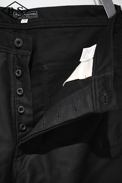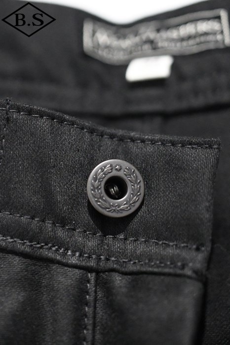 ブラックの月桂樹トップボタンとボタンフライを備える。