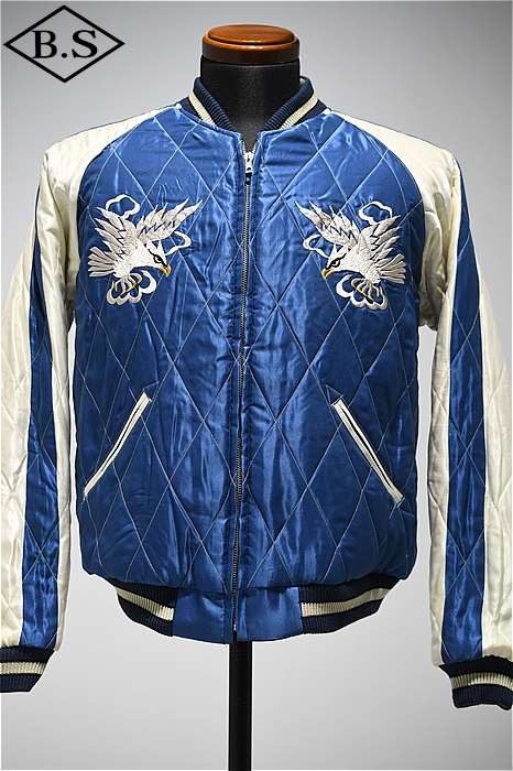 リバーシブル面は晴れ渡る空を想わせるブルーのアセテートに施された白鷲の絵柄。使用する色糸の数を抑え、運針のみで翼を広げた姿を描写している。刺繍の密度が高い鷲に対し、生地の色を生かして繊細な線で描かれた松の枝や余白のバランスの使い方が日本画にも似た芸術性の高い1着。