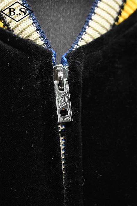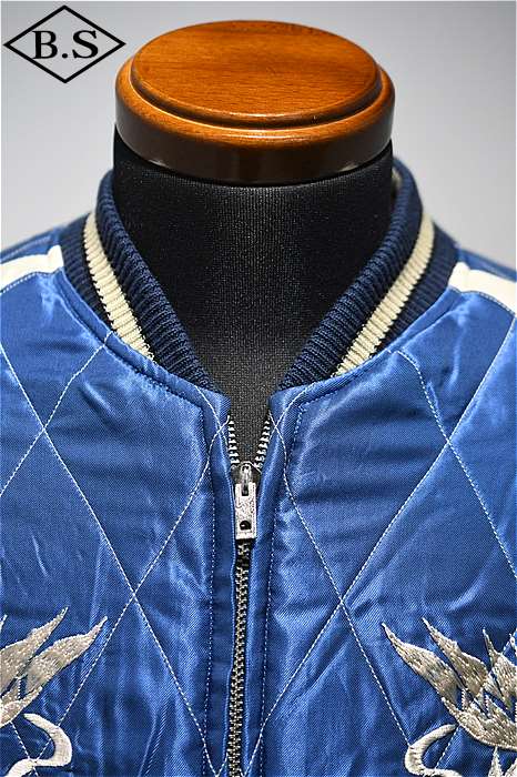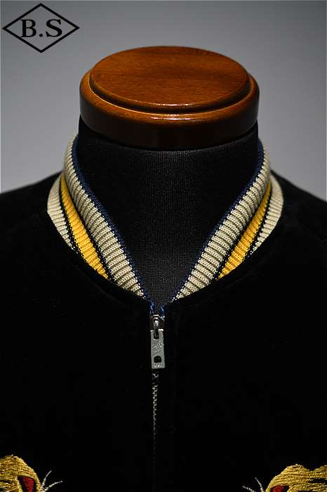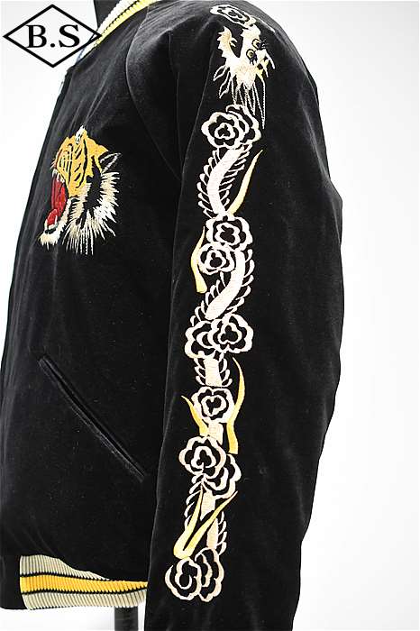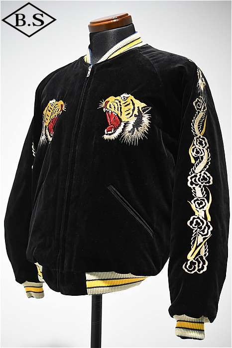 ブラックの別珍生地をベースとし、牙を剥き出して咆哮する迫力の虎を描いた1950年代中期の作品。振り幅の狭い細やかな刺繍で筋骨隆々な虎の体躯を写実的に表現しており、これは優れた技術を持つ熟練の職人にしか成し得ない業。袖に入る昇龍は通常より縦に長く、このような仕様もヴィンテージでは珍しい。