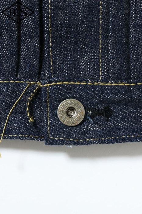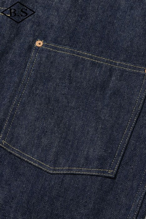 簡素化されたディテール、軍汎用のドーナツボタン、無地の鉄リベットなど「大戦モデル」を象徴するかのような特徴を持つ大戦後期、1945年モデルのデニムブラウス。もとにしたヴィンテージはワンウォッシュ、極上のミントコンディションのサイズ46インチ。さらにヴィンテージ市場で非常に人気の高いT-BACK仕様の個体を再現した。プリーツ部のボックスステッチはかなり小ぶりで、大戦モデルは一般的にオールイエローステッチと認知されているが、本作は一部にオレンジステッチも使用している。バックルは大戦後期のタイプを専用に製作。ムラが強く荒々しいデニムは、前回の1943年モデルともまた異なる魅力を持つ。襟の地の目、太めのカフスも個性的で、全体のサイズ感は大戦期特有の若干小さめの仕上がりとなっている。