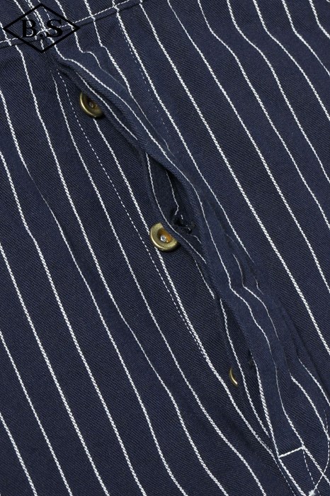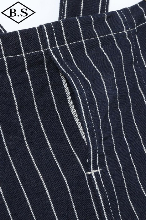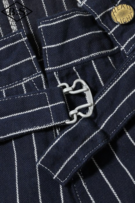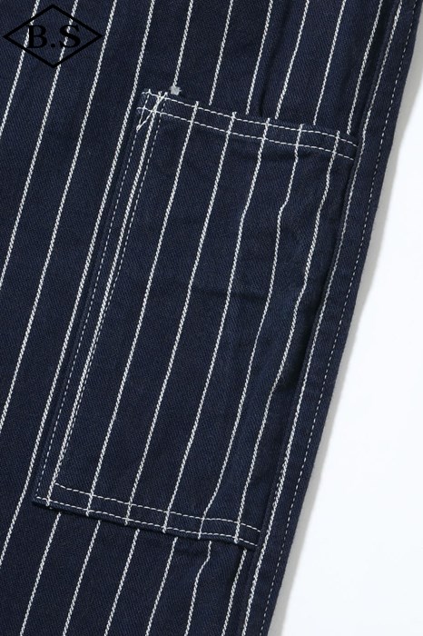 今回は1914年の広告で掲載されていた、ヴィンテージではほぼ現存していないウーブンストライプデニムのアイテムを展開。プリントではなく、織りで表現したストライプを強調していることから、明らかにStifel社などのウォバッシュストライプに対抗したものと思われる。販売店で配布されていたノベルティのノートに付いていた生地スワッチから分析を行い、10番手の綿糸をインディゴと生成、チャコールの3色を使用し、左綾で作製している。