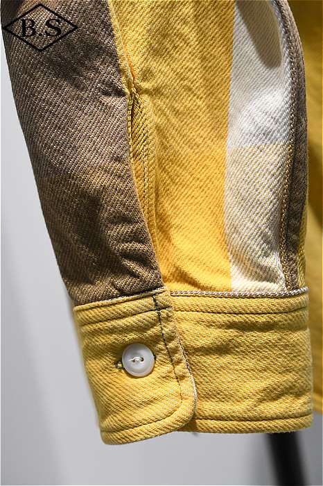 JELADOのネルシャツは、ユーズド感を大切にし、表面は油抜けしたようなカサカサ感を出し、裏は着込んで起毛が少し抑えられた雰囲気を表現しています。生地には同じ太番手の糸をタテとヨコに強く打ち込み、しっかりと裏起毛をかけ、その後製品加工で油抜けをさせています。これにより、通常のネルシャツよりも手間のかかった一枚が完成しています。