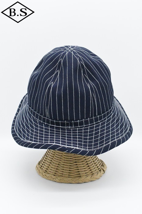 ヴィンテージの縫製の癖をなるべく再現しながら製作しています。例えば、裏の縫い合わせが切りっぱなしで上からテープを縫いつける部分や、帯の縫い付け方などがポイントとなっています。ヴィンテージファッションにおいて欠かせないファティーグハットです。青タグも、ヴィンテージ同様にランダムな色落ちが楽しめるように、タテ糸を3種類の太さで織り上げているため不規則な色落ちが楽しめます。