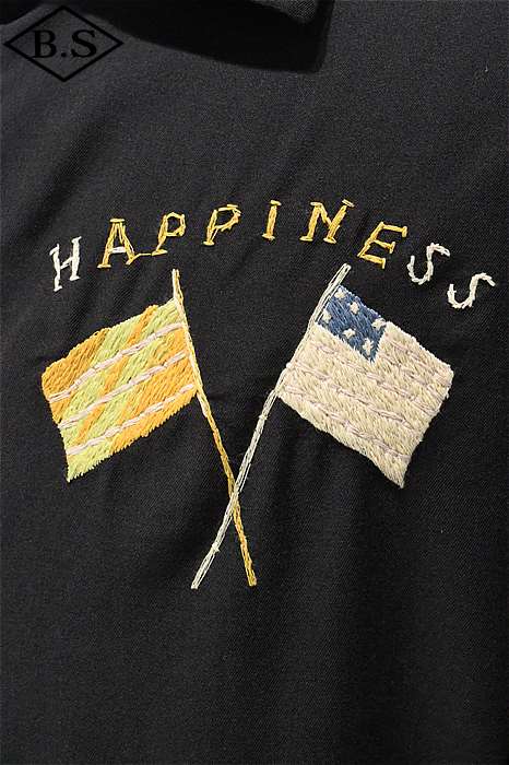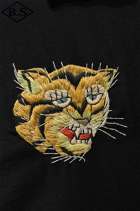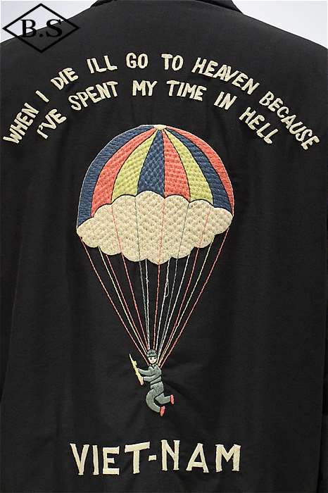 両袖の龍や右胸の虎はベトジャンの王道的なデザインだが、左胸は漢字の「福」ではなく珍しい2色使いの「HAPPINESS」表記。その下には星条旗と南ベトナム軍のフラッグがクロスし、背中にはパラシュート部隊のモチーフが刺繍されている。