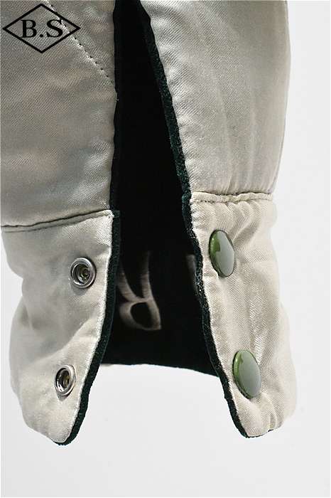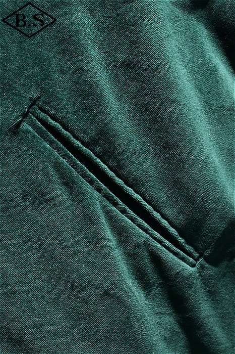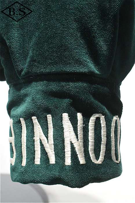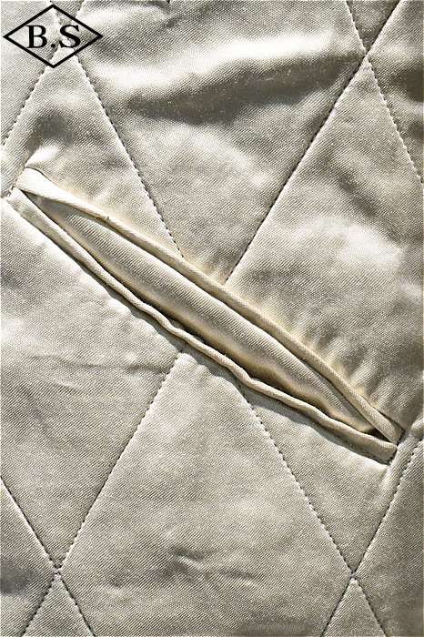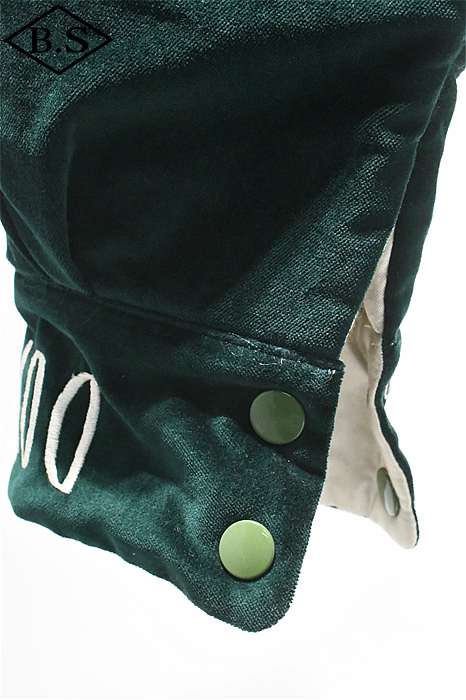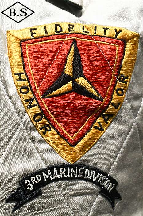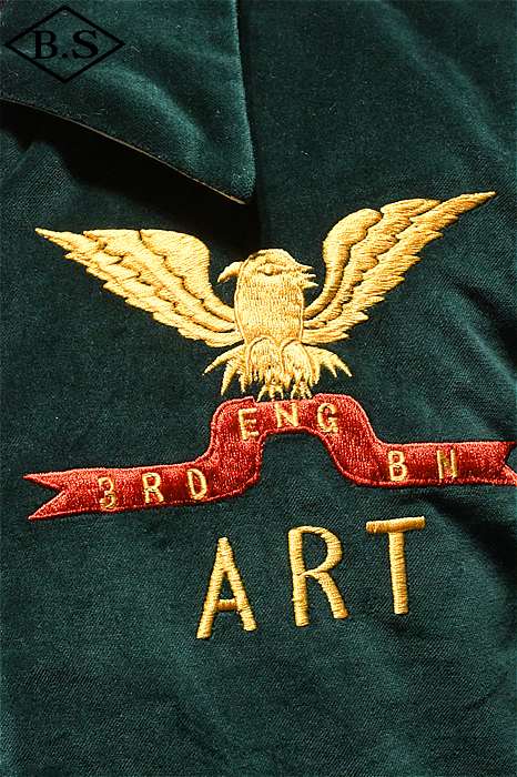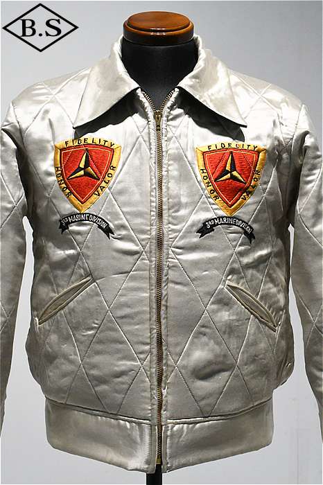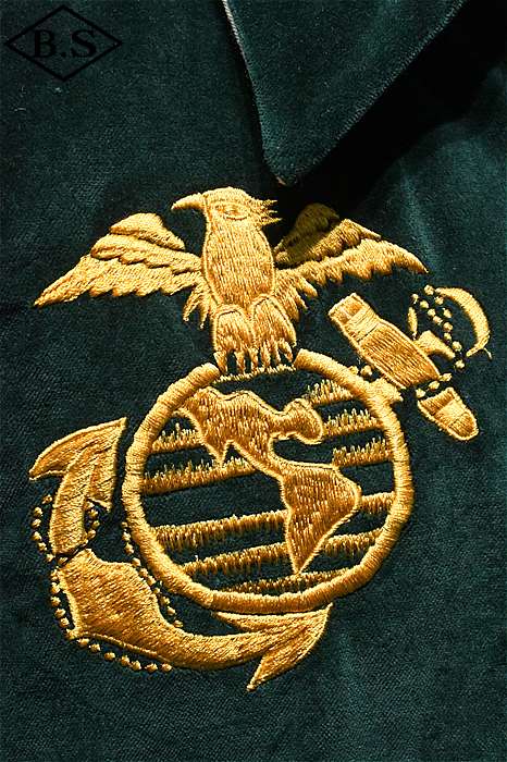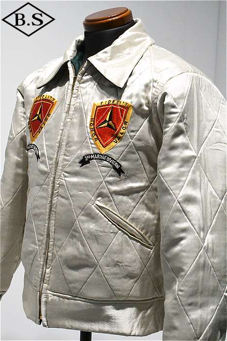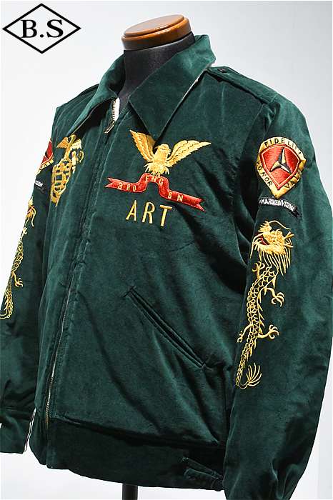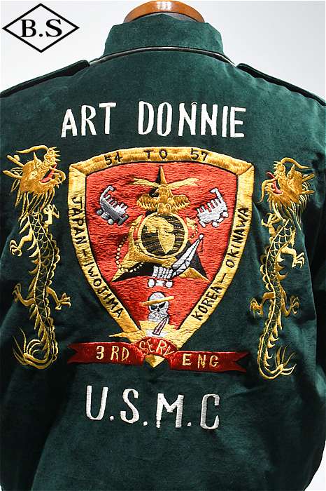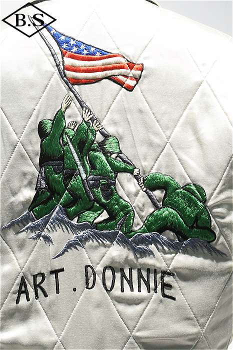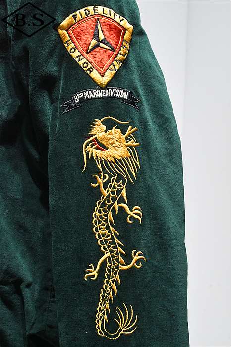 一点ものが多い軍人のオーダーシリーズで、今回は海兵隊に所属していた方のスカジャンを両面再現しました。A面は背中に大きなスコードロン刺繍が施され、両袖にドラゴンが描かれ、両胸だけでなくカフスにまで豪華な刺繍が入った豪華なパターンです。B面には硫黄島の刺繍が施されたスペシャルなデザインとなっています。今回はボディのデザインも完全再現されており、他に類を見ないライダースタイプのデザインです。エポレットのついたカフスタイプのブルゾン型で、腰にはアジャスターが付いています。A面は綿100%の別珍を別注で染め使用し、B面はレーヨンサテンを使用しています。中綿には厚手のくず綿を使用し、ヴィンテージらしい着心地と雰囲気を演出しています。B面のキルトはハンドキルトで施され、当時と同じ見栄えになるように最大限の努力が行われています。ボディのデザインから刺繍の柄、カラーリングまで、最上級のレアなスカジャンが当時の技術で再現された究極の一着です。