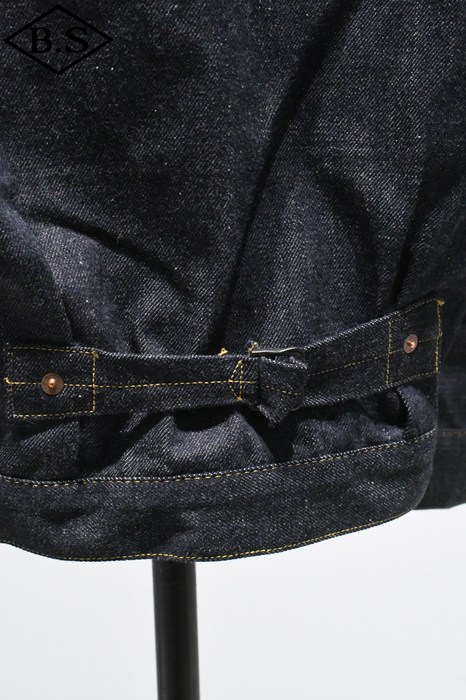 片面赤タブ、針シンチバック最終移行期年代、プリーツステッチの大きさとボタン横に揃う位置、リベット刻印ビック「O」、鉄ボタンなど当時のディティールを当たり前に備えたほか、ショートレングスの着丈や、幅太の袖形状など創りとカタチを確認頂きたいモデルです。