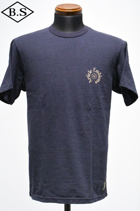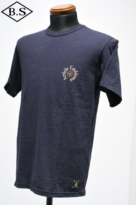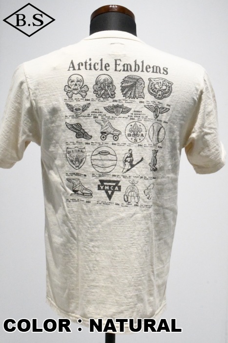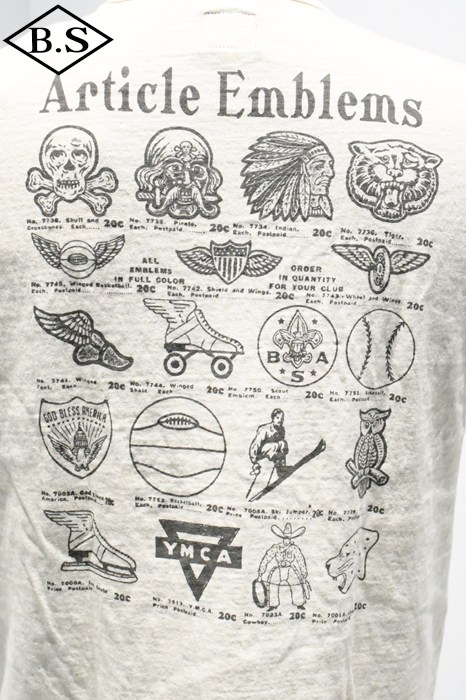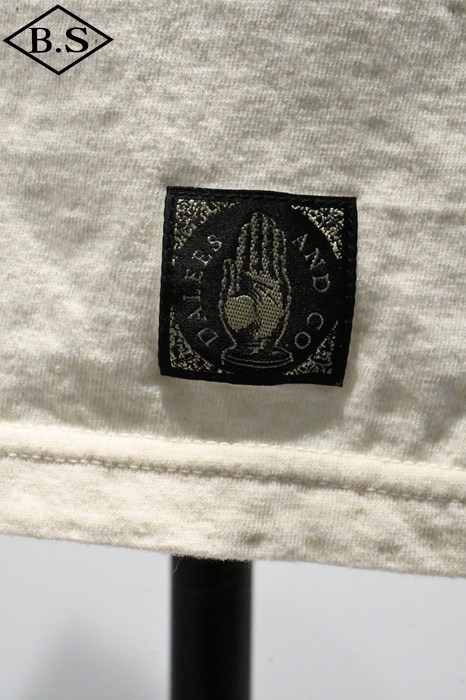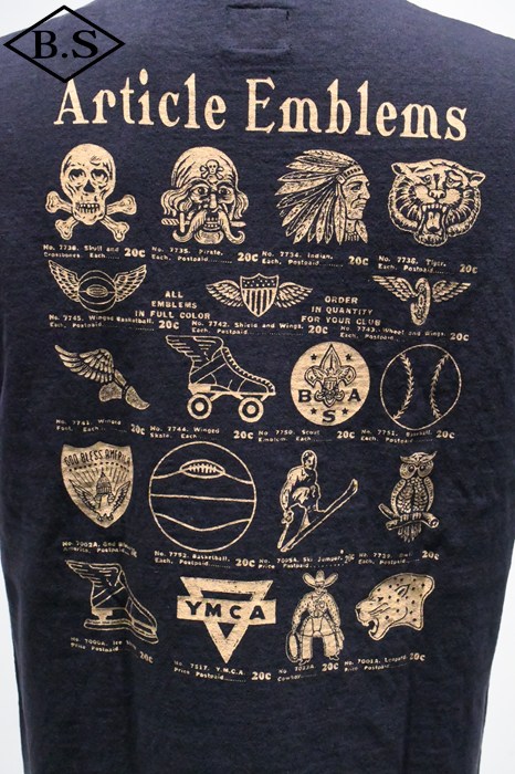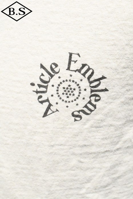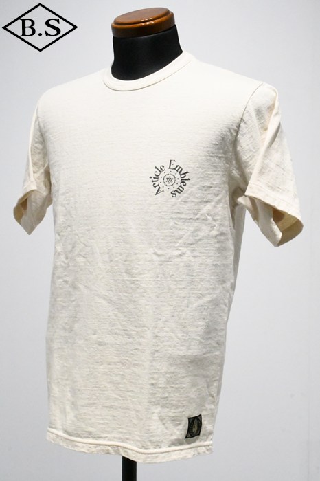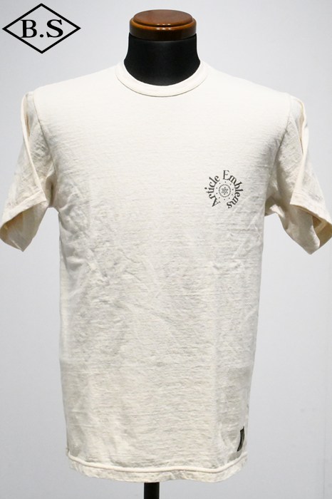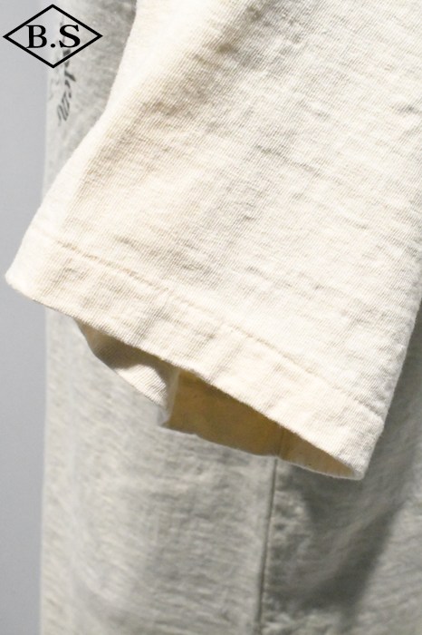 和歌山の旧式吊編機により、ゆっくり空気を含みながら編み上げたオリジナルの丸胴生地。凸凹のムラ糸表面をガスバーナーで焼き、毛羽を焼却したガス焼きスラブ糸から編み上げた天竺素材は、至高の着心地とサラリとした手触りそして横に走る凹凸感が雰囲気抜群のTシャツです。プリントは狂騒の1920年代デザイン。