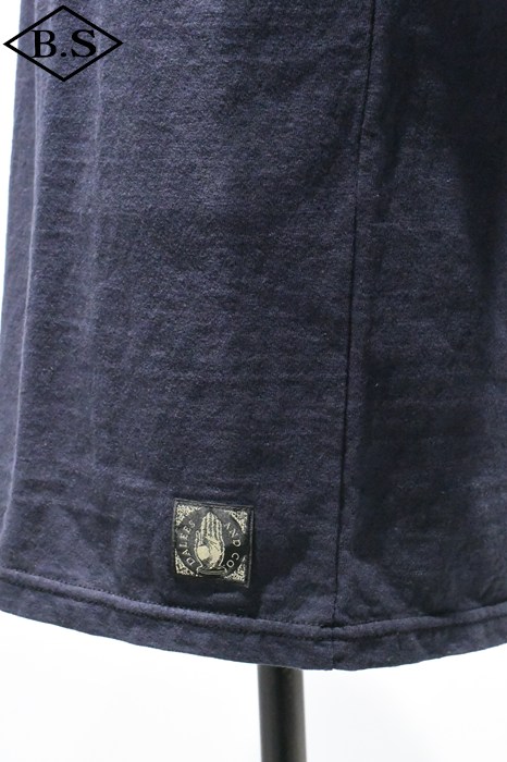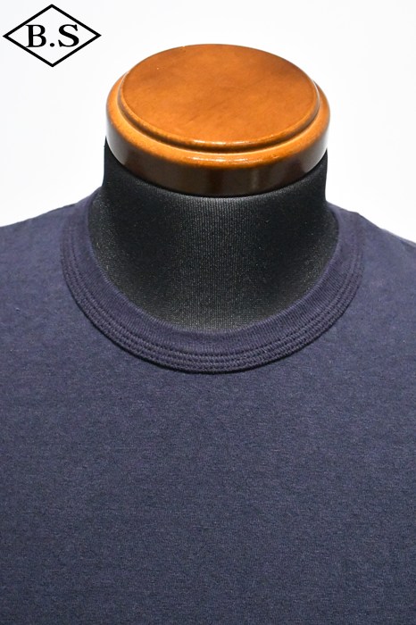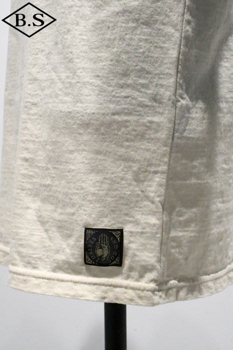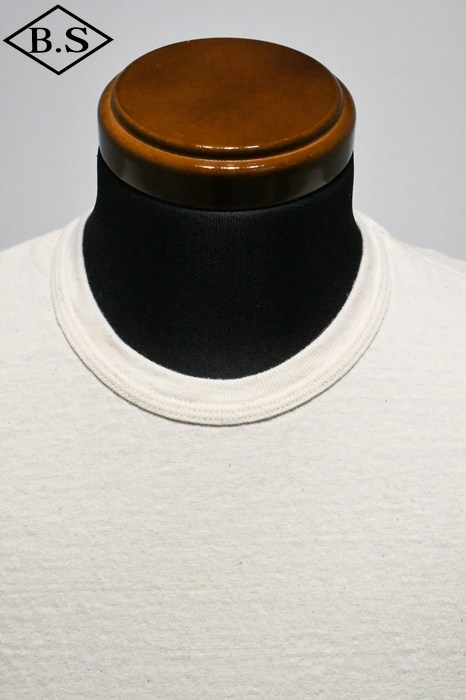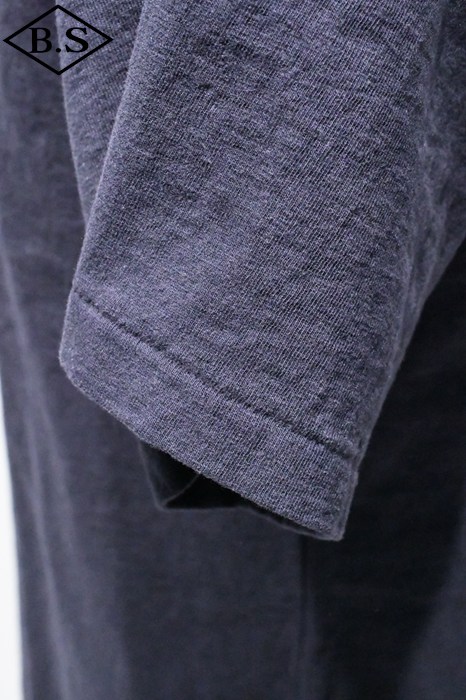 20番ムラ糸を編み糸段階でガスバーナーで焼き、着心地と伸縮性、毛玉防止を兼ねたオリジナル7oz吊天竺素材。