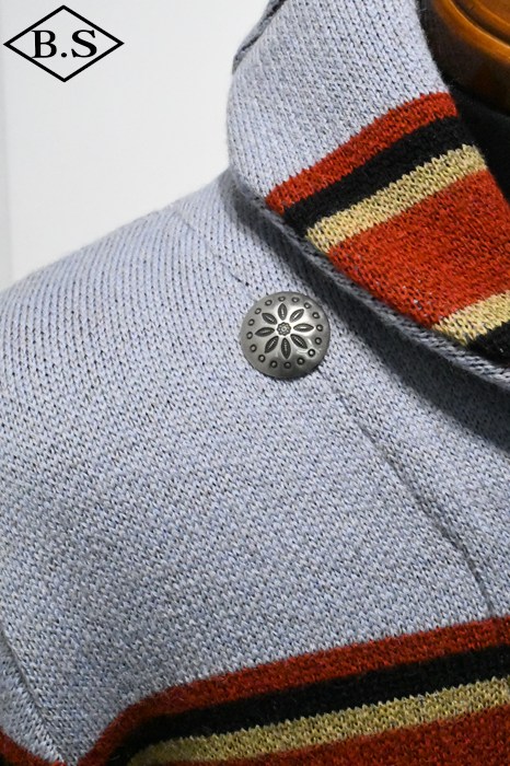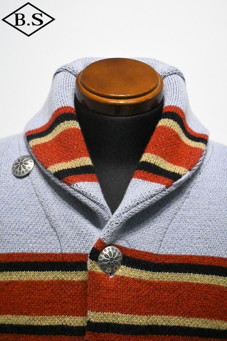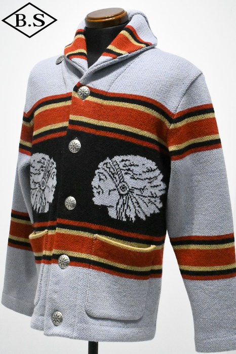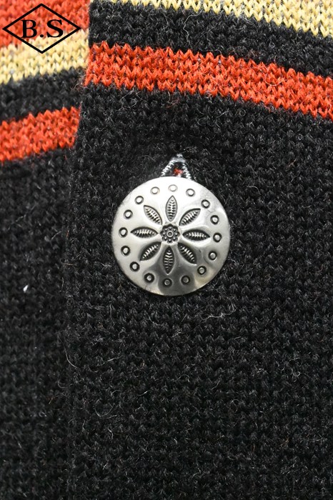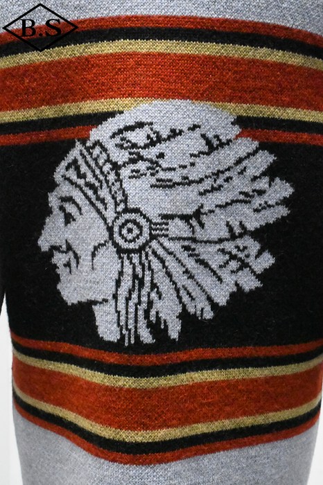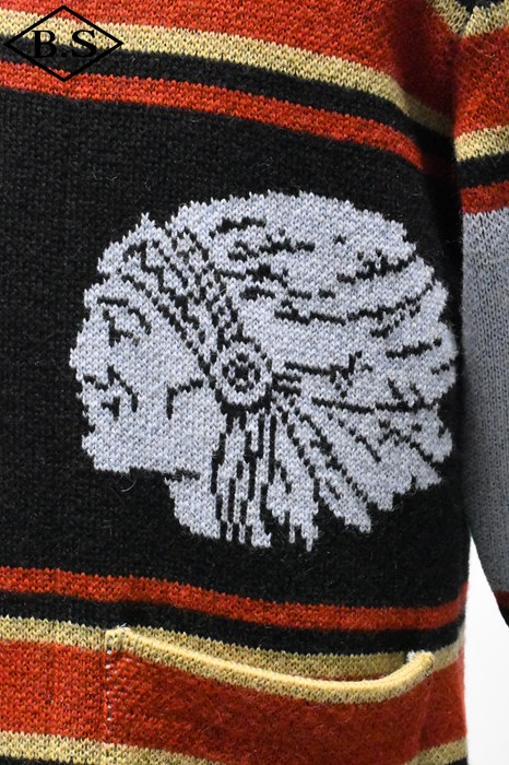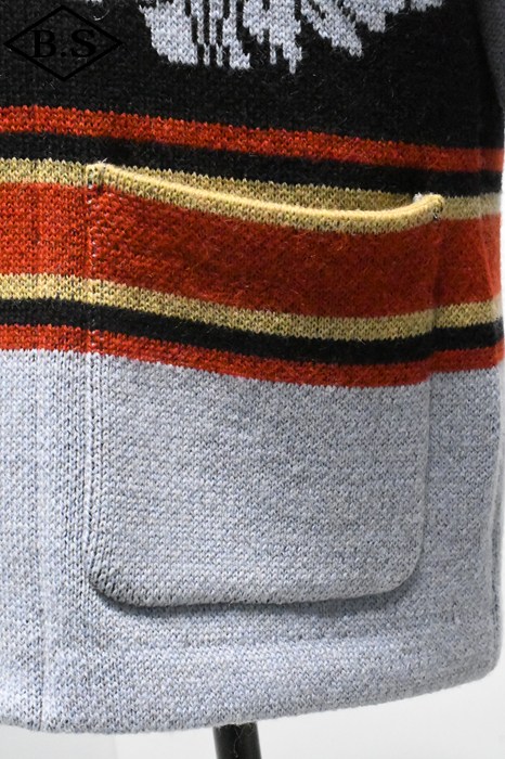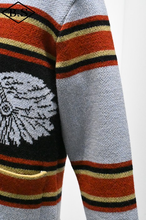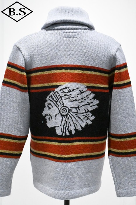 2025年のコレクションテーマは、「THE CREAM OF THE CACHE」。最上級のコレクションを意味する造語であり、一年を通じてJELADO秘蔵のヴィンテージアイテムを厳選し、再現していきます。 昨年大好評だった「ラグナ」を、今回は大胆にイメージを刷新。弊社所有のヴィンテージブランケットからサンプリングし、新たに編み立てました。 インディアンヘッドが描かれたブランケットの配色を基調にしながらも、カーディガンとしてのバランスを考慮。ネイティブアメリカンのエッセンスを活かしたデザインに仕上げています。 素材には、4本撚りのメリノウール糸を使用し、5ゲージのヘビーな編み立てを採用。しっかりとした肉厚な仕上がりで、保温性と存在感を両立しています。 また、フロントだけでなく背面にもインディアンヘッドの大胆なモチーフを配置し、個性的なアクセントを演出。 ネイティブ調のメタルボタンには、Made in USAのBLACK HAWK社製コンチョボタンを採用し、さらなる雰囲気をプラス。 高品質な糸で丁寧に編み上げられており、肌触りも抜群です。 デニムやチノ、ミリタリートラウザーなど、さまざまなスタイルにマッチする万能な一着。 ヴィンテージの魅力を取り入れた、JELADOならではのこだわりの一枚をぜひご堪能ください。