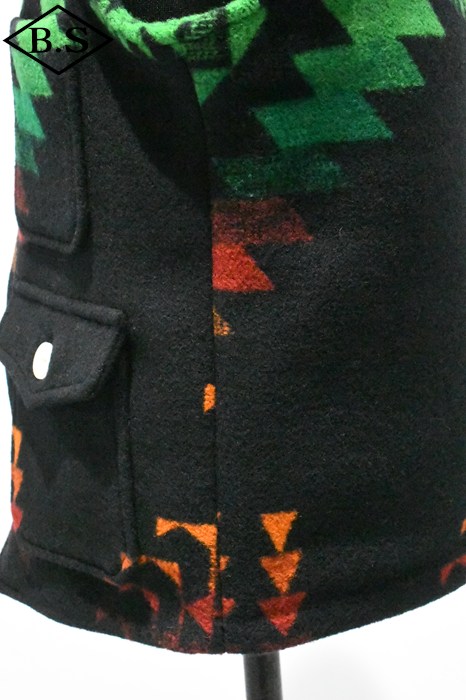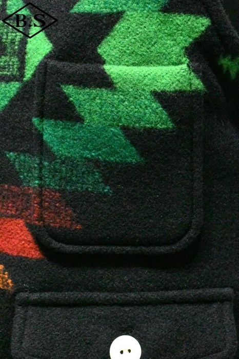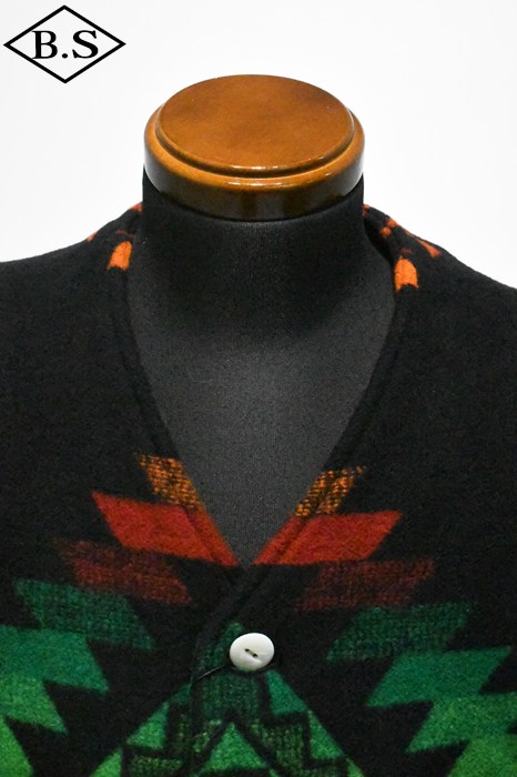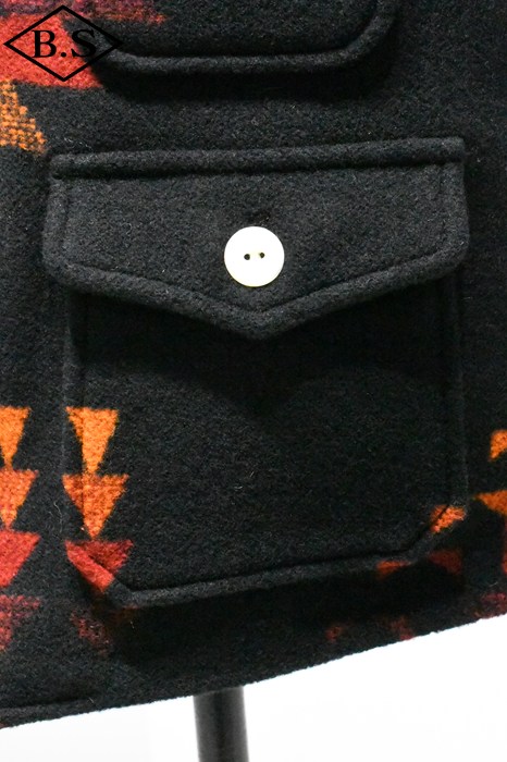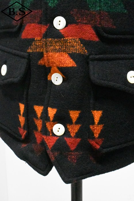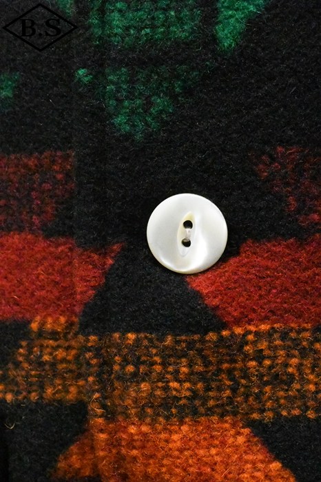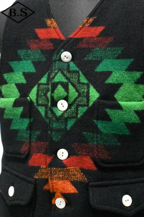 現しました。素材には1920年代のブランケット生地を忠実に再現したウール92%、ナイロン8%の両面起毛ジャガードを採用。特に黒ベースの配色は、ヴィンテージ市場でもほとんど見つからない貴重なデザインです。 オーストラリア産メリノウール100%の40番双糸をタテ糸に使用し、糸質の良さを引き出す「レベルアップウール」仕様。ヨコ糸はウール90%、ナイロン10%の5番単糸を採用し、英国羊毛に近いハリとコシを持たせつつ、ナイロンを加えて強度と柔らかさを両立しました。国内でも希少な総柄ジャガード織機を使用し、熟練職人の手で織り上げた生地には特殊な起毛加工と樹脂加工を施し、ブランケット特有の質感とスポンジのような柔らかさを実現。 左右の柄を揃えて裁断・縫製するため、サイズが大きくなるほど用尺が増え、手間のかかる仕様となっていますが、柄のバランスと高級感を最優先し、贅沢な配置で仕上げました。ボタンにはシェルボタンを採用し、1920年代以前の雰囲気と品格を演出。 細部にまでこだわり抜いた、まさに「THECREAM OF THE CACHE」の名にふさわしい最高峰のブランケットベスト。ヴィンテージ再現への情熱とクラフトマンシップを、ぜひお楽しみください。