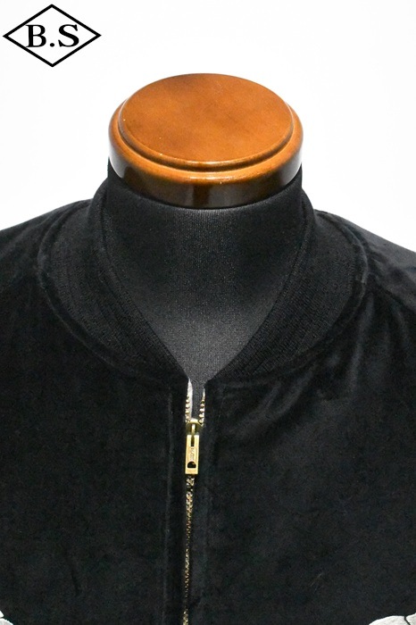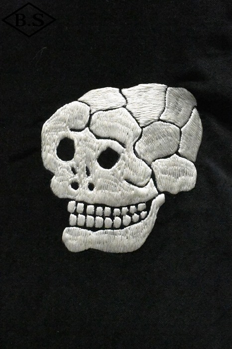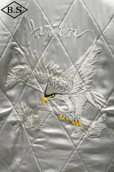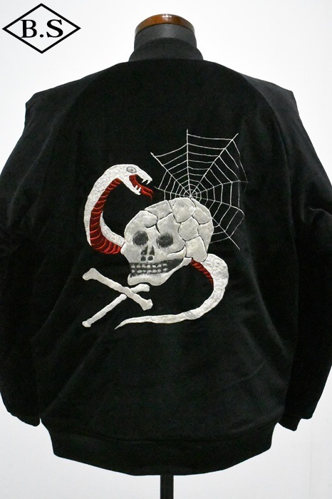 A面は綿100%の別珍生地を使用し、スカル&スネークのモチーフを刺繍。B面はレーヨンサテンに鷹の刺繍を施しました。