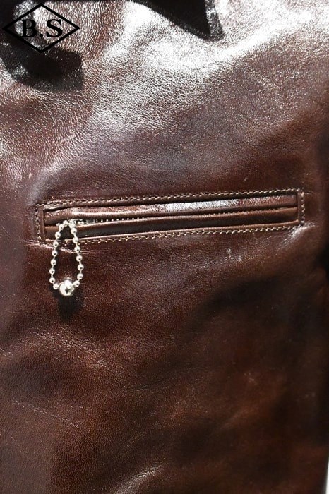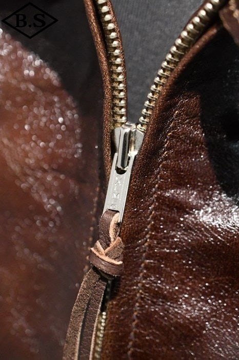 ファスナーは、30年代の角型TALONを元にしたオリジナルで、ファスナーテープエンドも実物同様の金属プレートをカシメで止めるタイプを組み合わせ胸のボールチェーンも実物同様のボールチェーンをオリジナル刻印入りで製作して取り付けてあります。