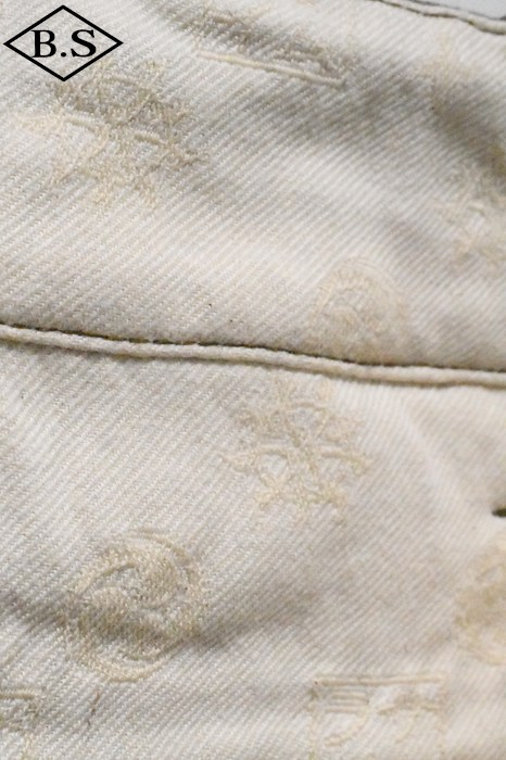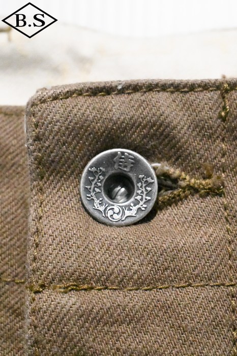 裏には刃モデルでお馴染みの家紋柄スレーキを使い、ヘビィーな生地との相性を考えてタックボタン仕様とし、松の木ボタンを採用しています。他、ギャランティーチケットや上段ネームはチノパンツならではの仕様です。